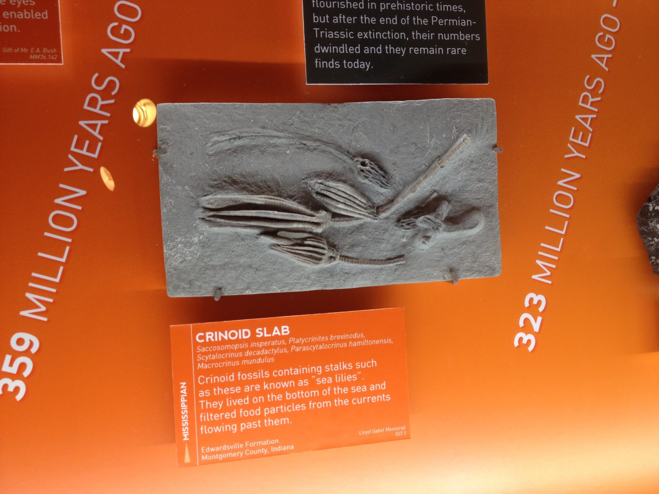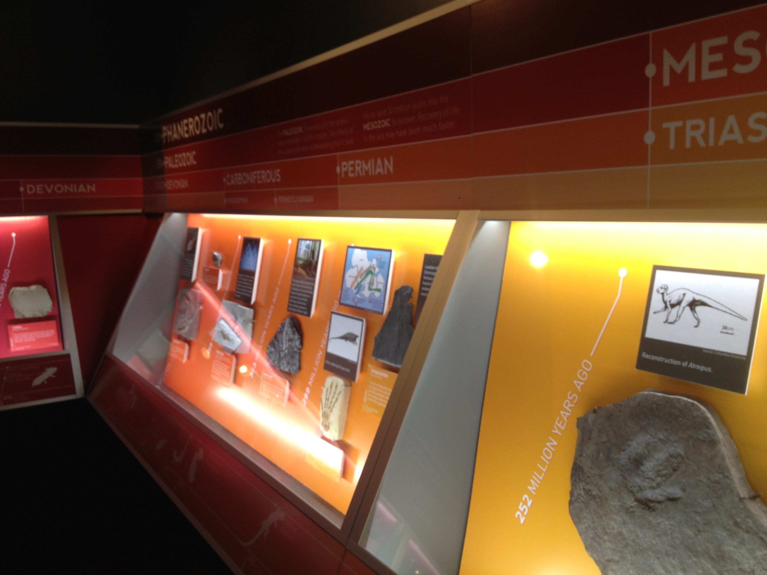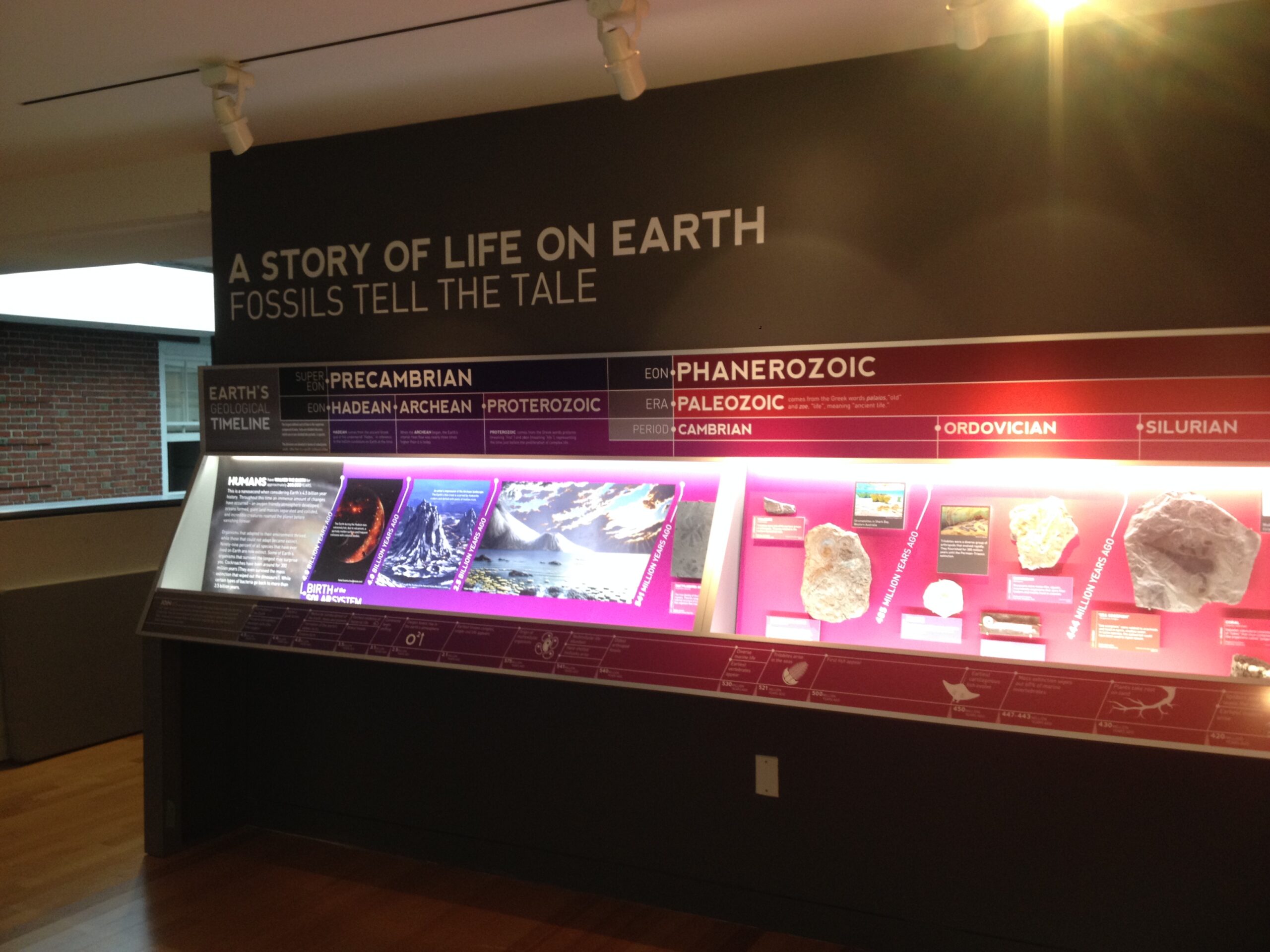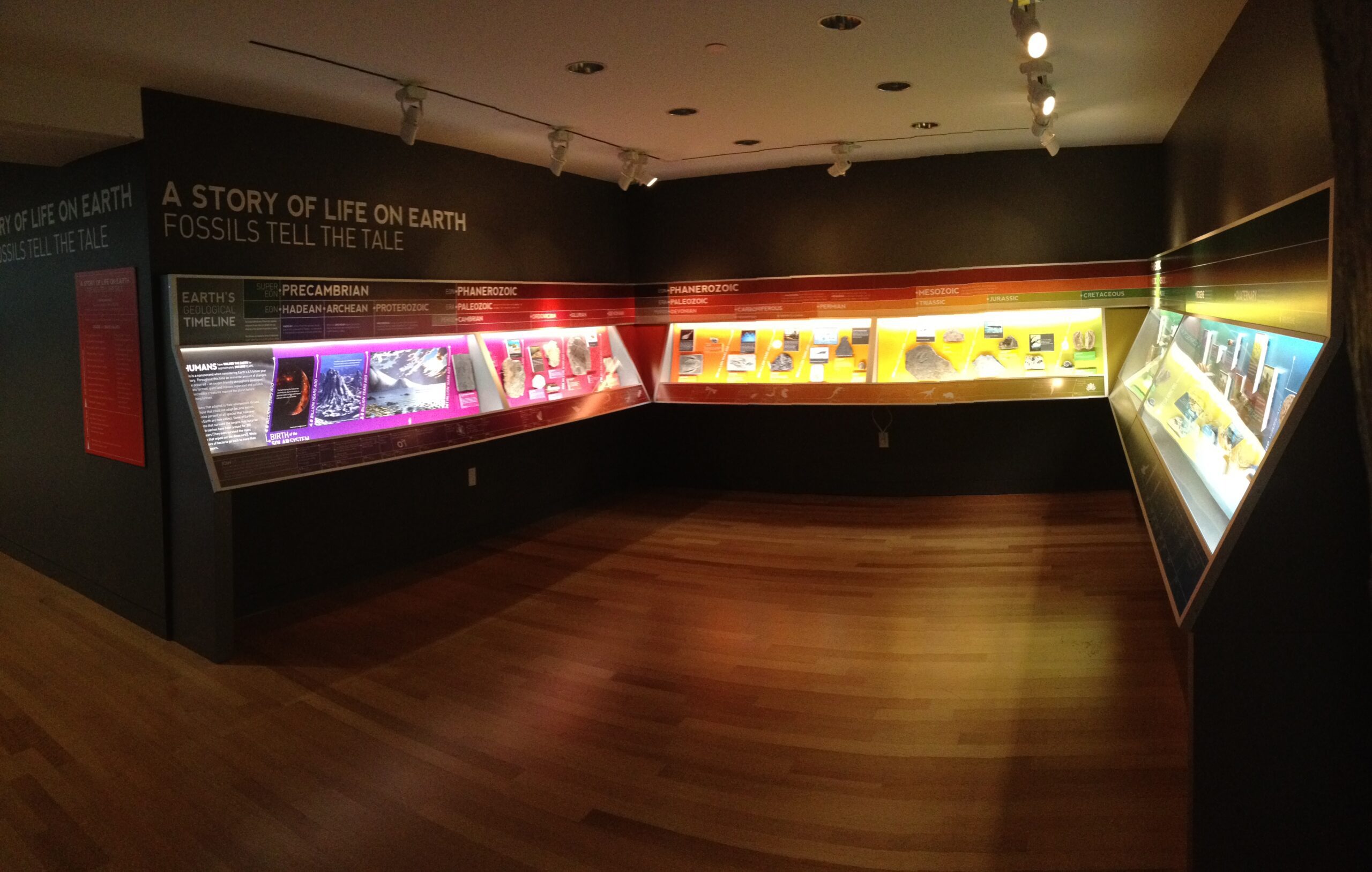 A STORY OF LIFE ON EARTH: FOSSILS TELL THE TALE presents the museum’s fossil collection in the context of the 4.5 billion year history of the earth. The color coded 45 linear feet of casework presents each fossil with a descriptive label and illustration aligned to its eon, era, period and epoch. An abbreviated timeline of earth’s milestone events runs along the lower portion of the case.