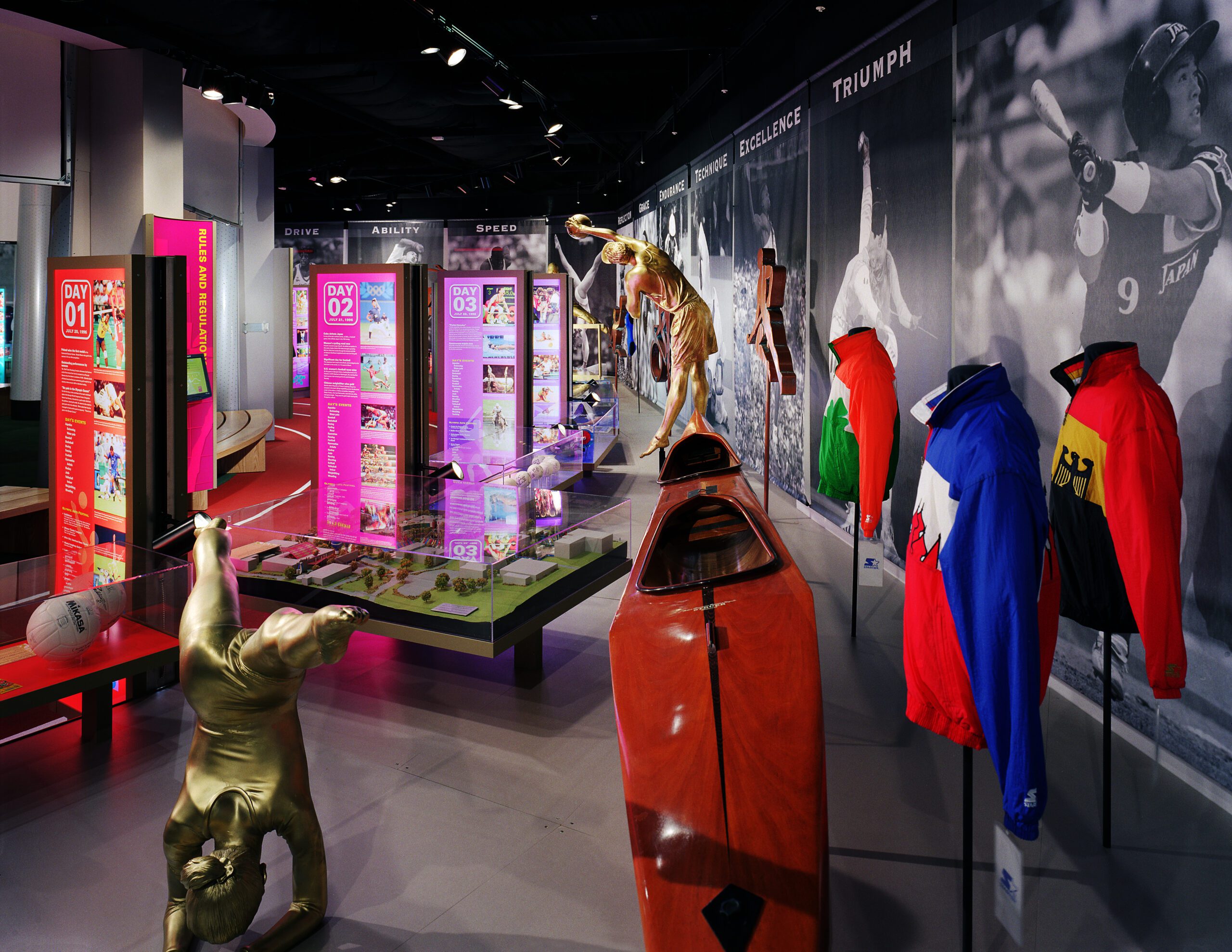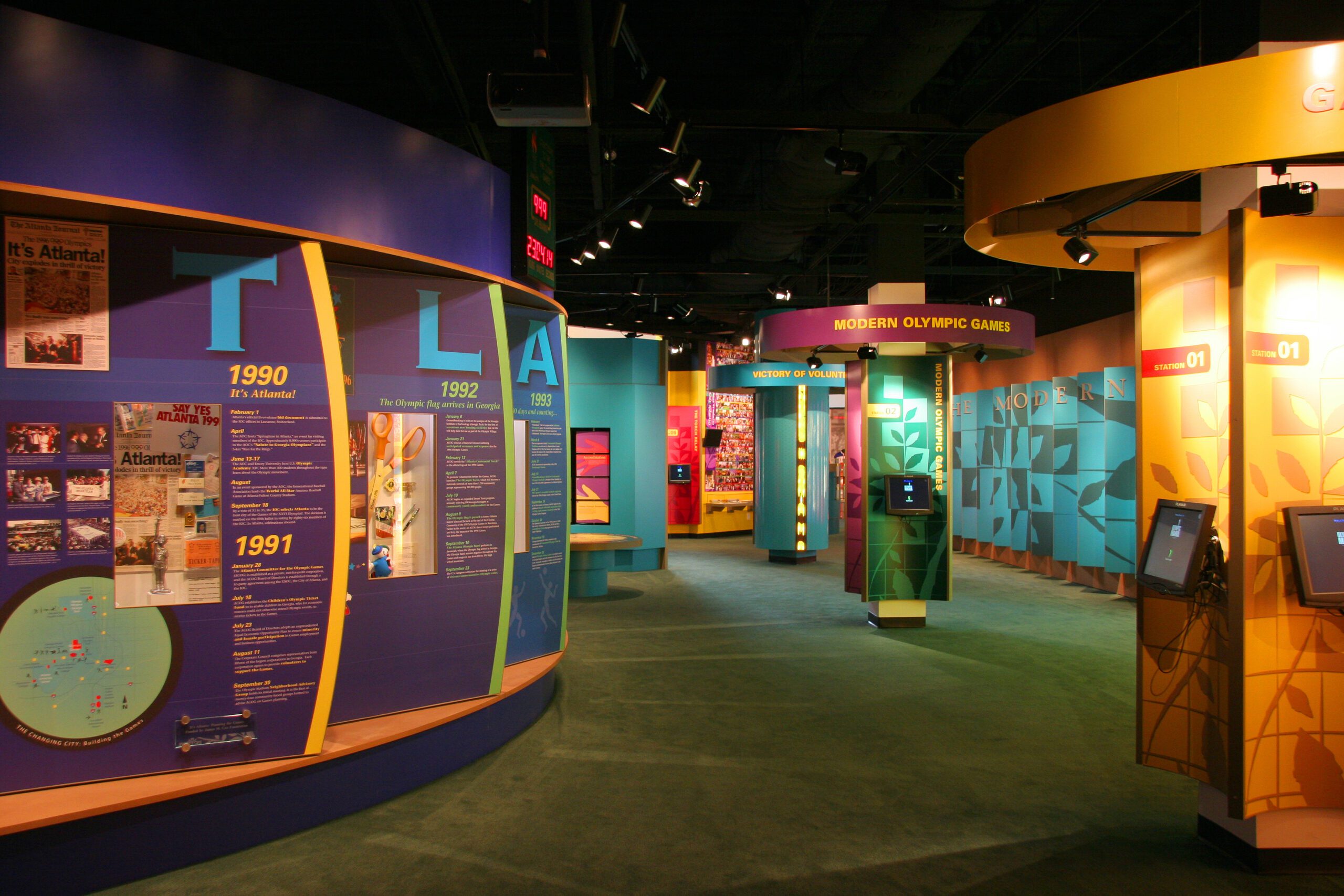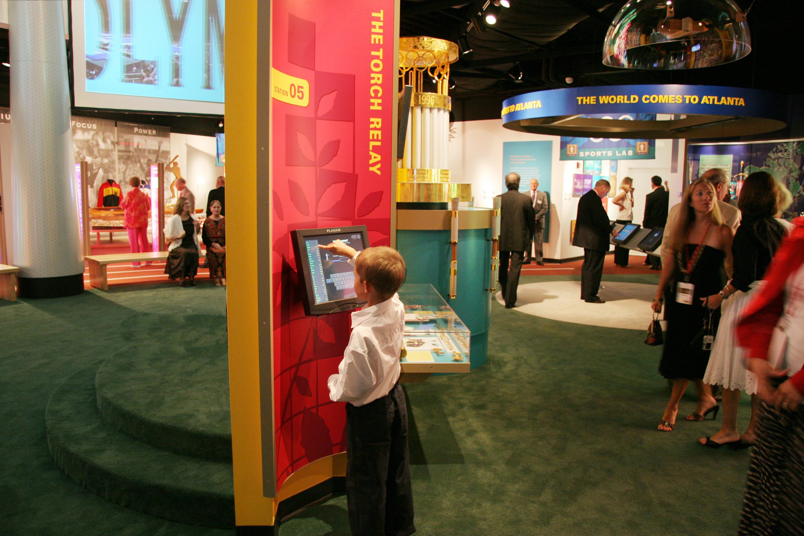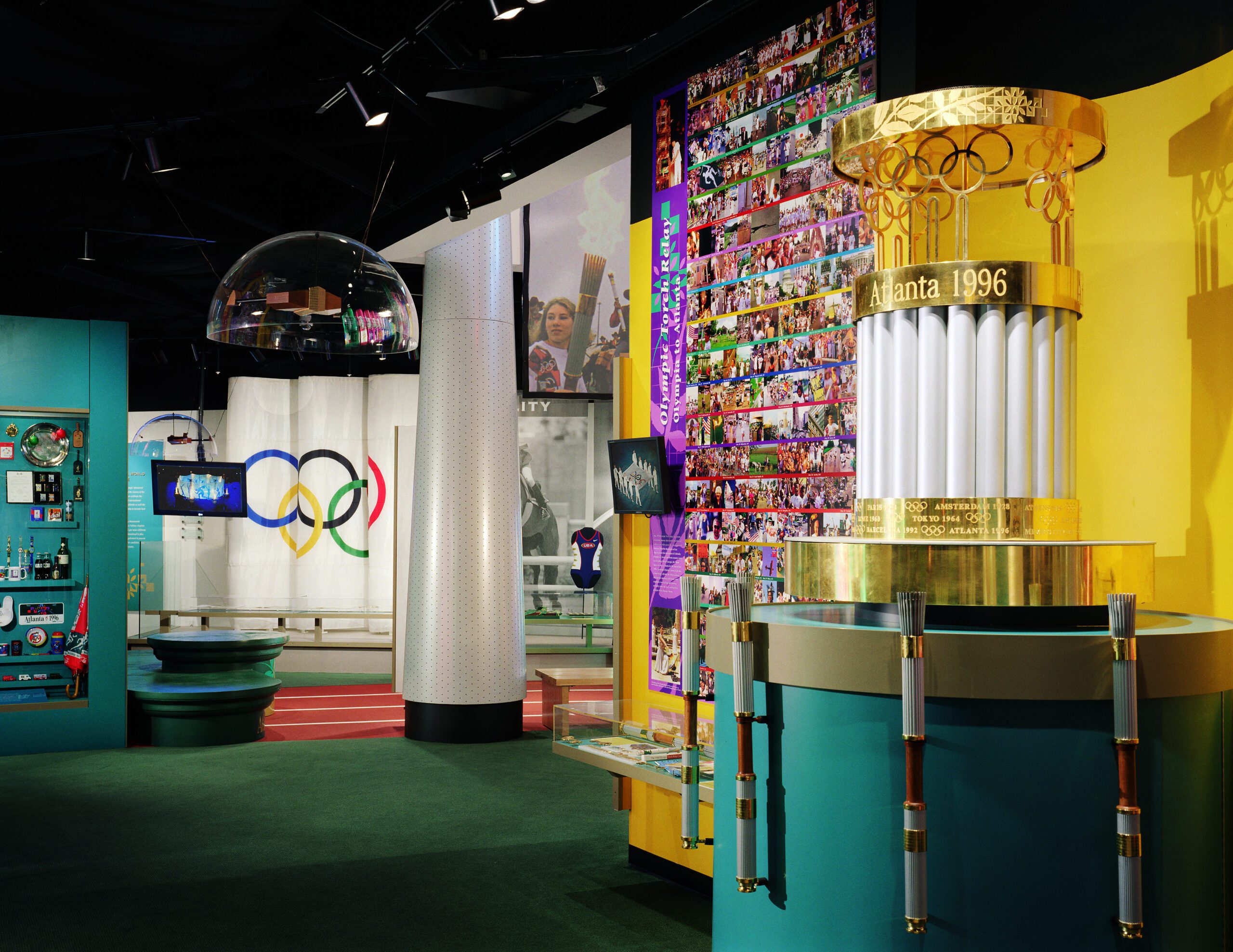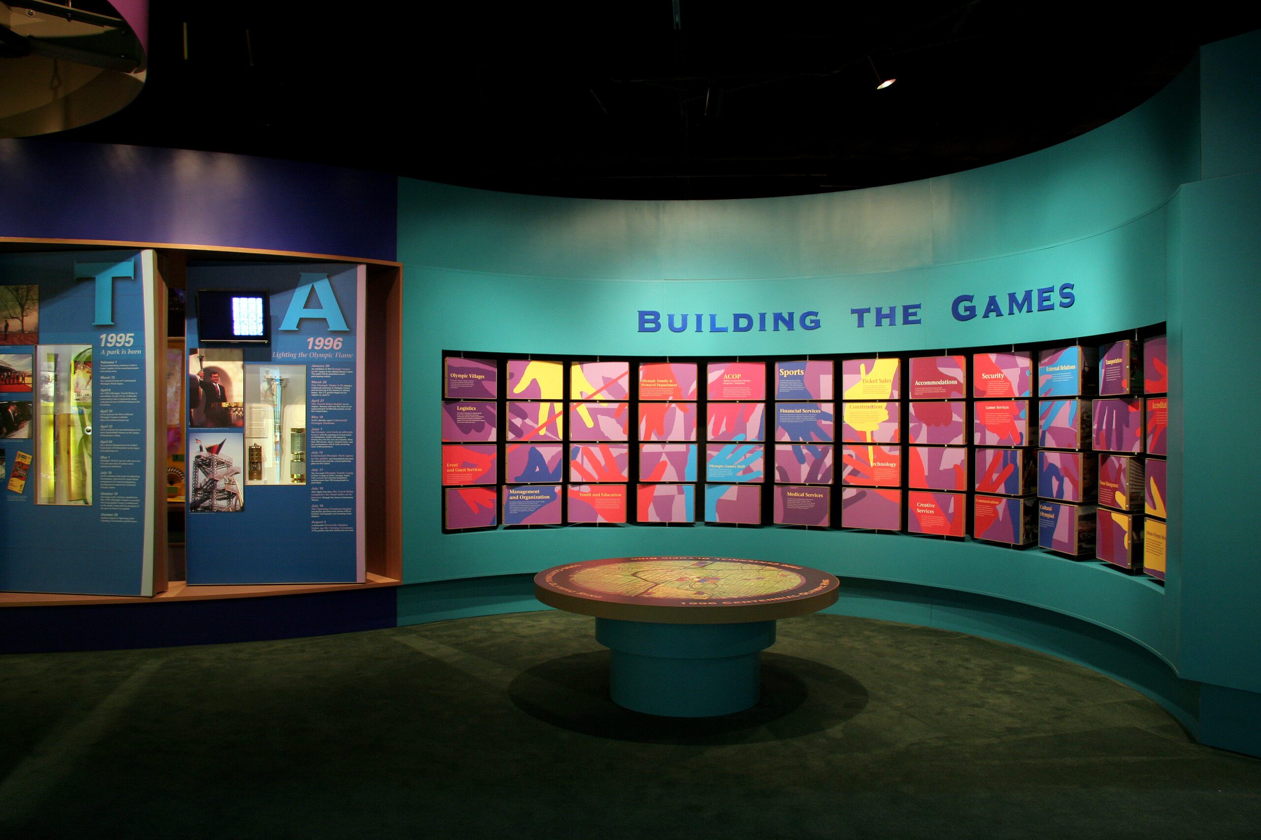 The exhibition is an exciting blend of artifacts, graphic design, media and interactive technologies used to present the hundreds of factoids, personal narratives, athletes’ memories and reflections on the game. Through an interactive computer game that links 12 stations with the winner’s platform, visitors young and old compete with each other to test their knowledge of various theme areas. The large two-story atrium, complete with replica columns from Centennial Park, provides a gathering space for school groups, a four screen multi-media theater and a view beyond to the 16 days of athletic events or a view above to the Olympic Sports Lab.