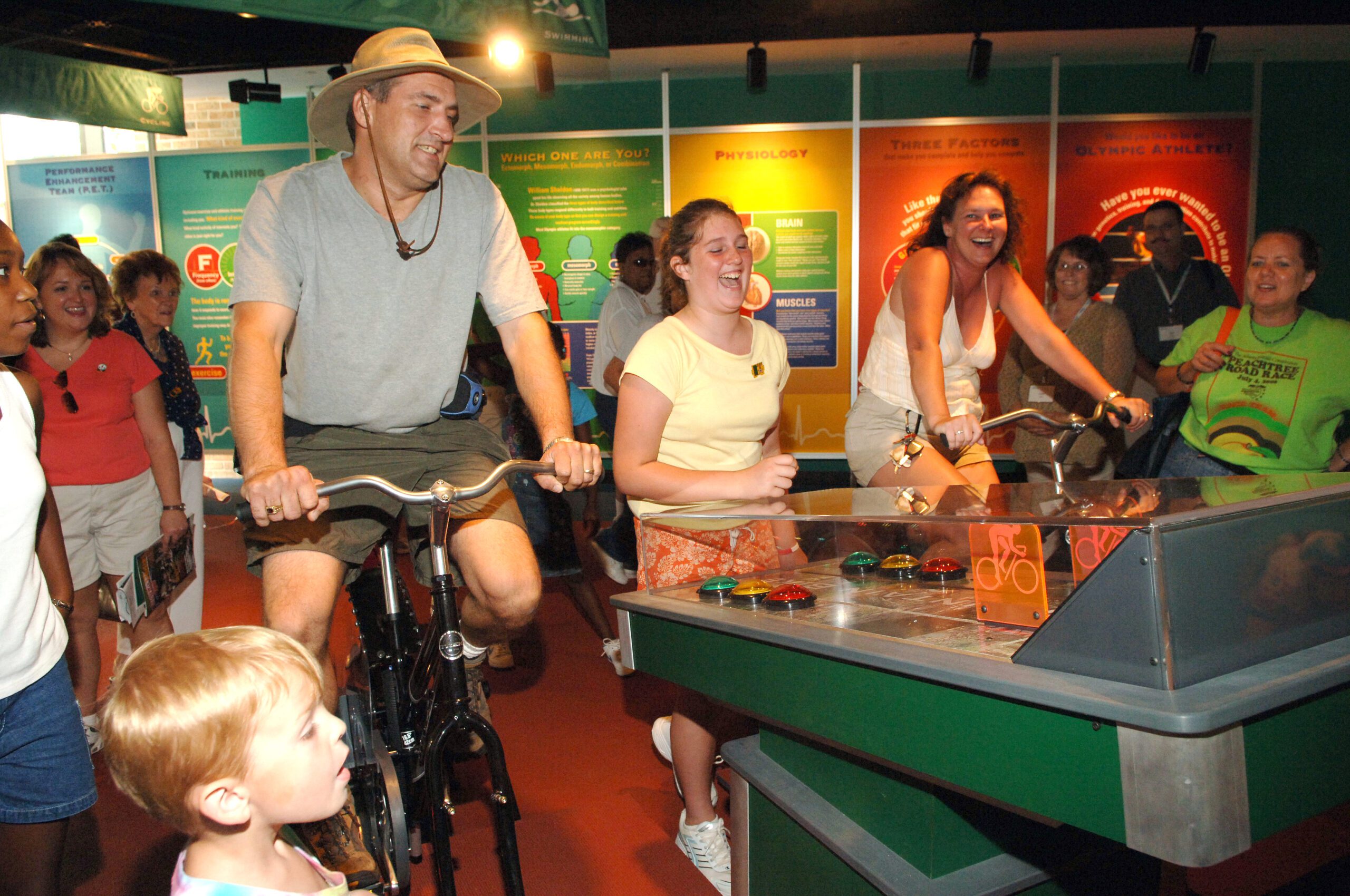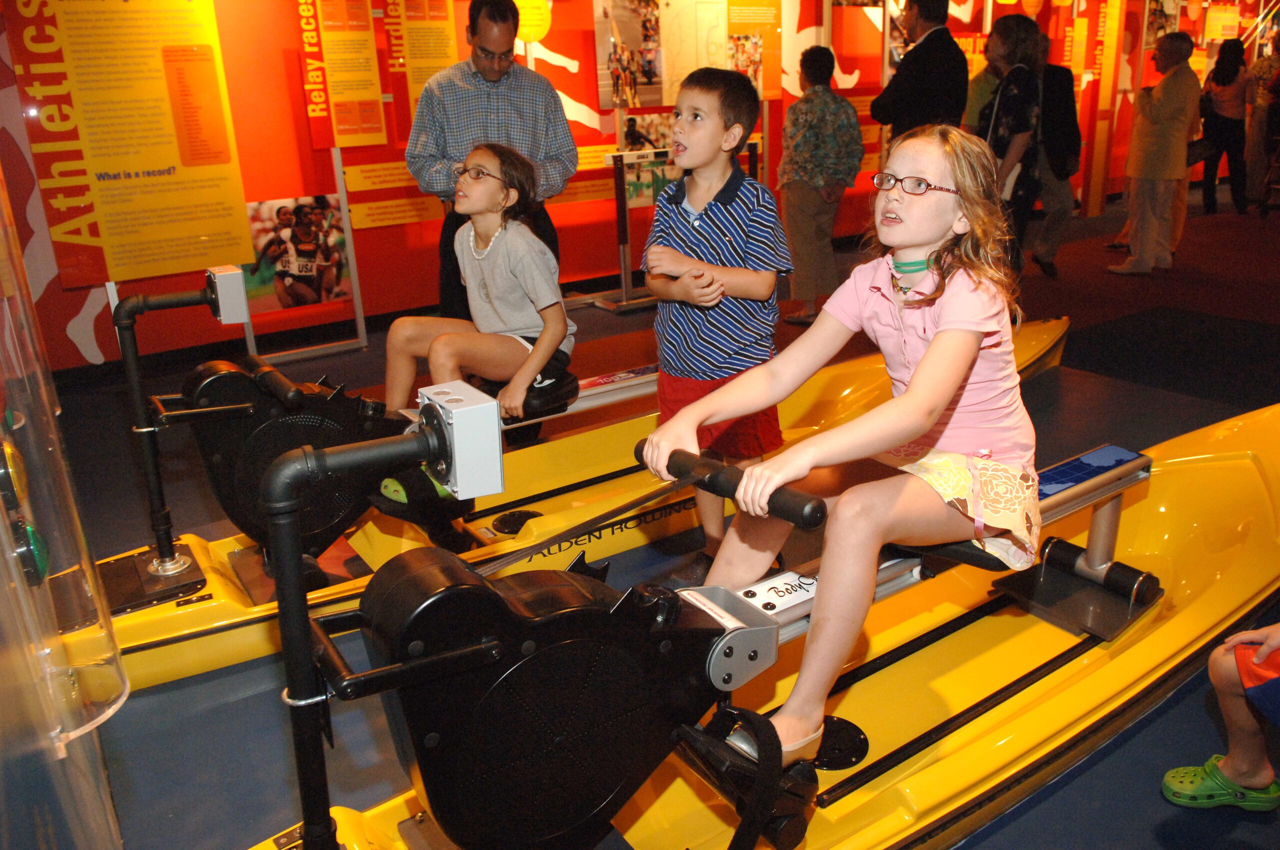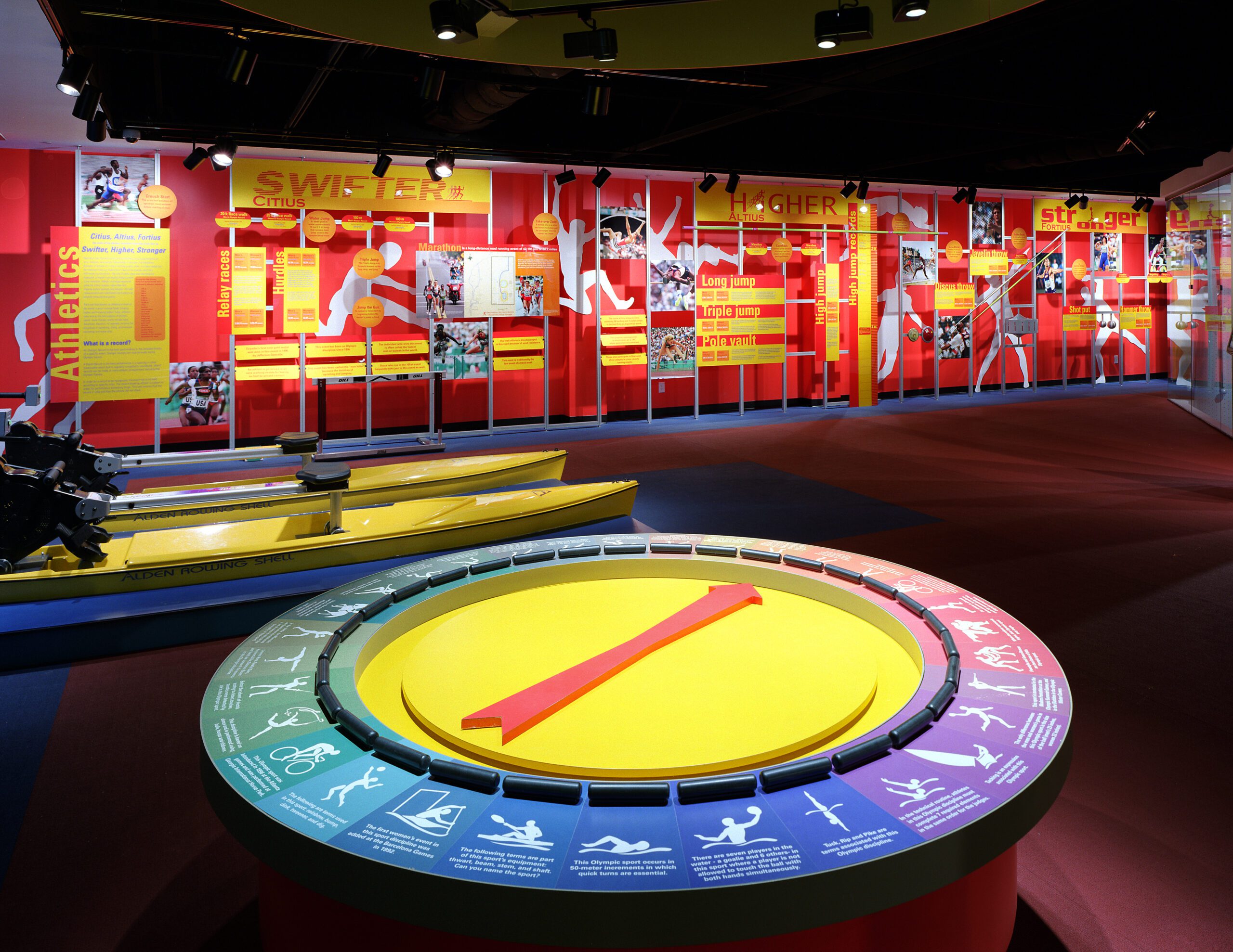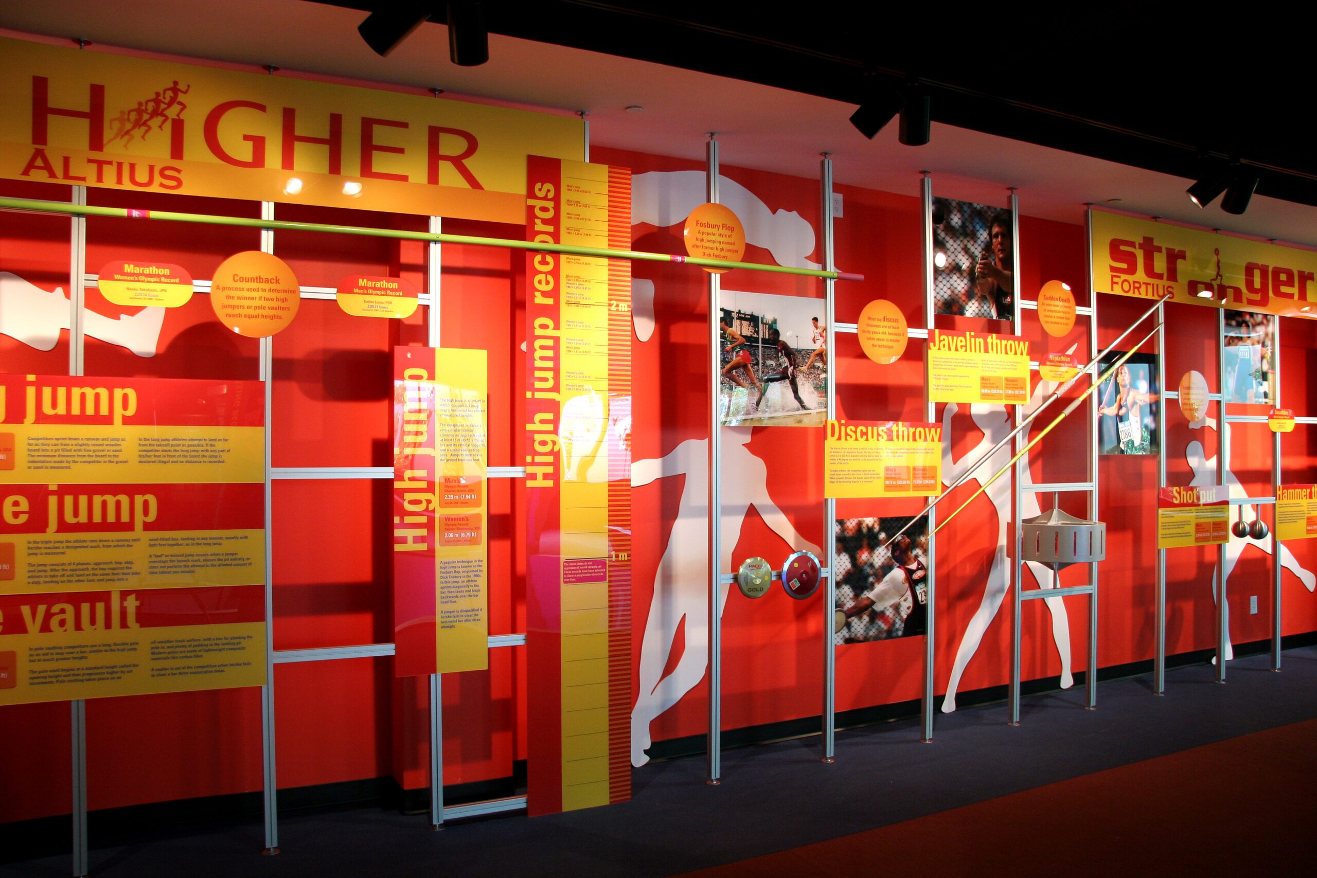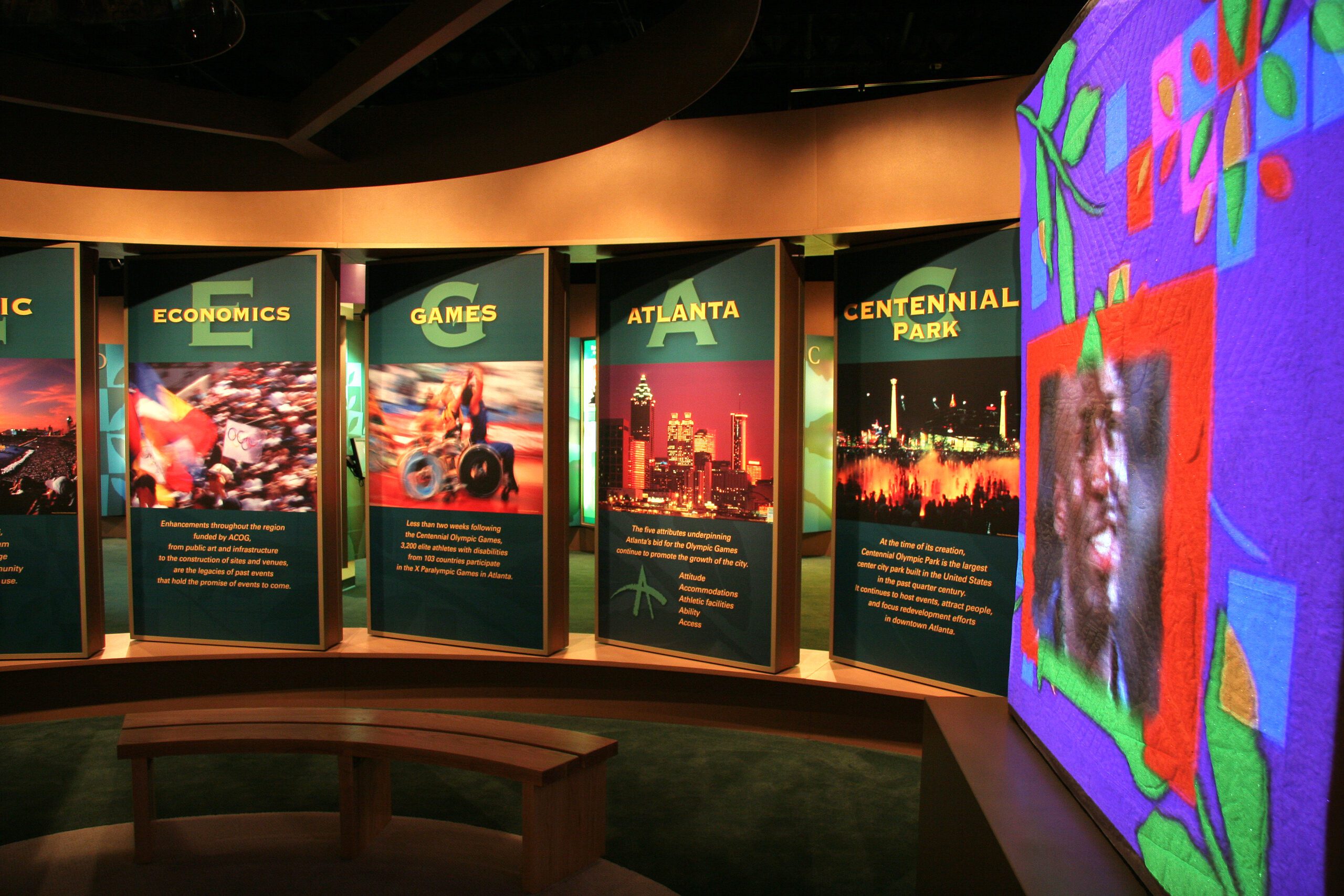 The exhibition is an exciting blend of artifacts, graphic design, media and interactive technologies used to present the hundreds of factoids, personal narratives, athletes’ memories and reflections on the game. Through an interactive computer game that links 12 stations with the winner’s platform, visitors young and old compete with each other to test their knowledge of various theme areas. The large two-story atrium, complete with replica columns from Centennial Park, provides a gathering space for school groups, a four screen multi-media theater and a view beyond to the 16 days of athletic events or a view above to the Olympic Sports Lab.
