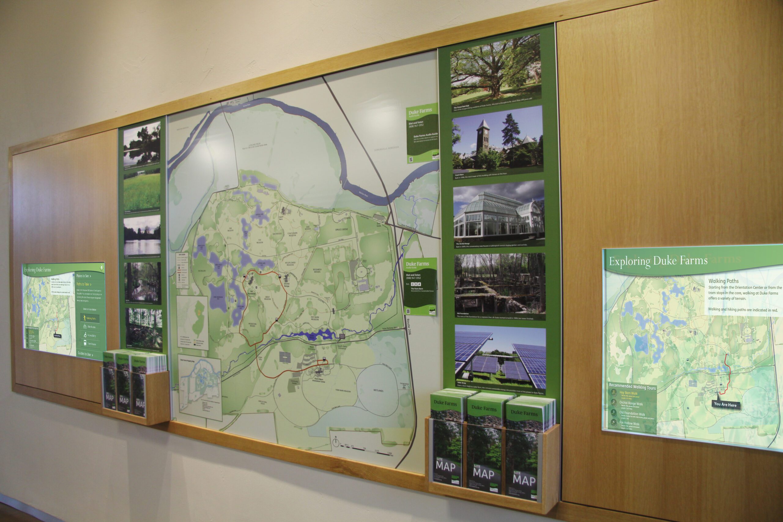 The 22,000 sq. ft. Orientation Center is a LEED platinum converted horse barn where visitors learn about the environmental and cultural history of Duke farms through exhibits and interactive displays. On the grounds, information and directional signs aid visitors as they experience regenerated habitats firsthand. An Eco-kit, print materials and an audio tour are available to enhance the visitor experience.