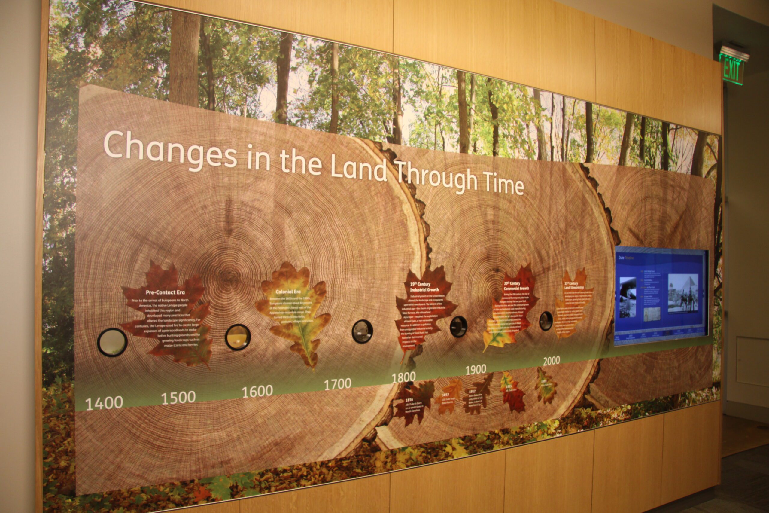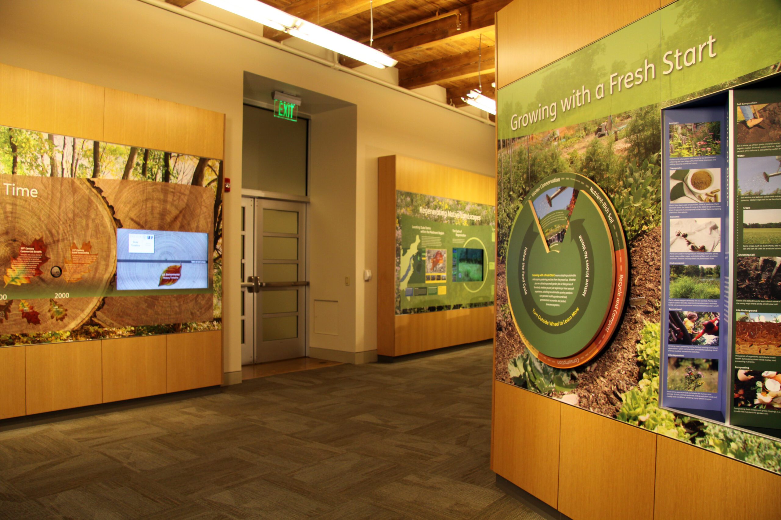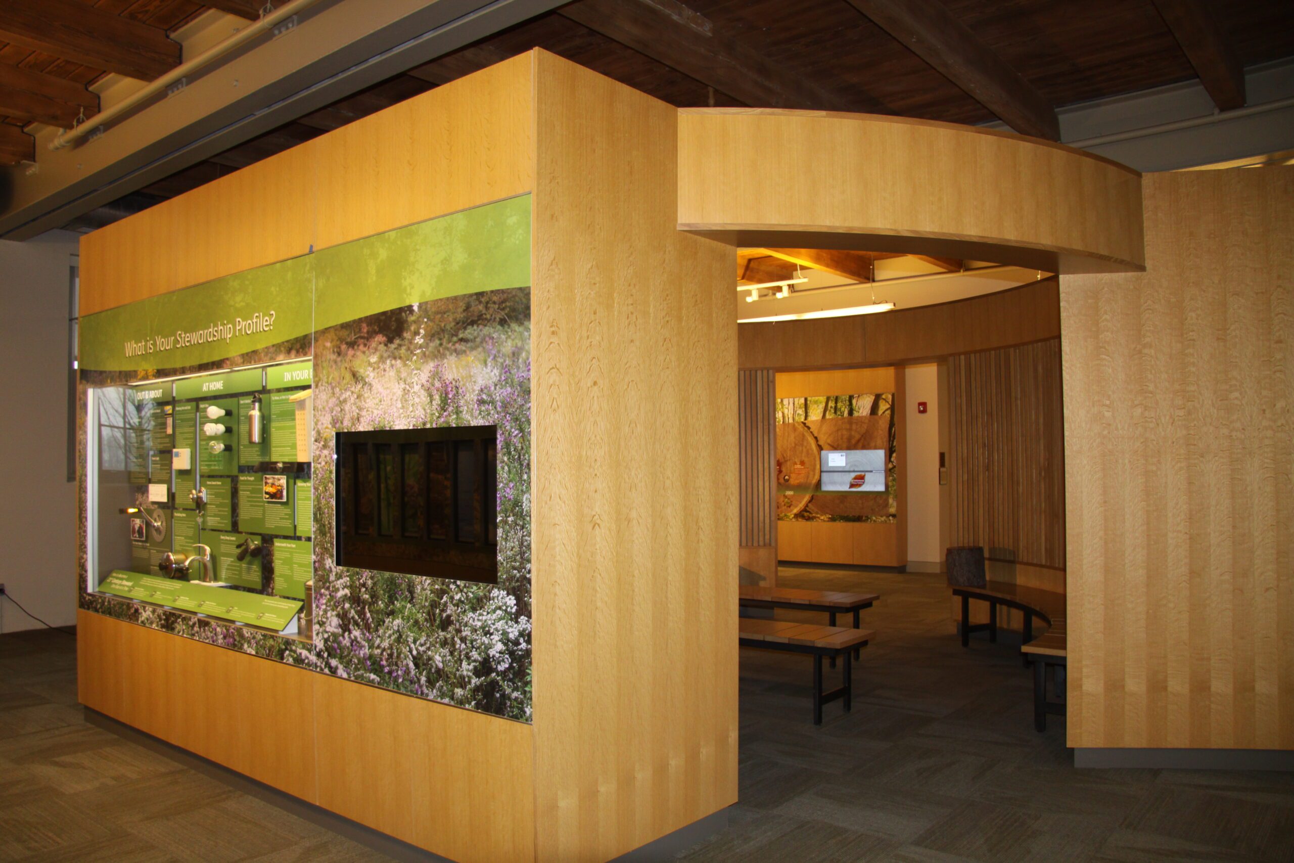 The exhibits in the Orientation Center were designed and fabricated with LEED certification in mind. Made from white oak harvested within 500 miles of the property, the veneers for the panels were milled from the fewest number of trees from the same forest. The interactive displays get their electricity from the solar array and the screens dim unless they are actively being used.