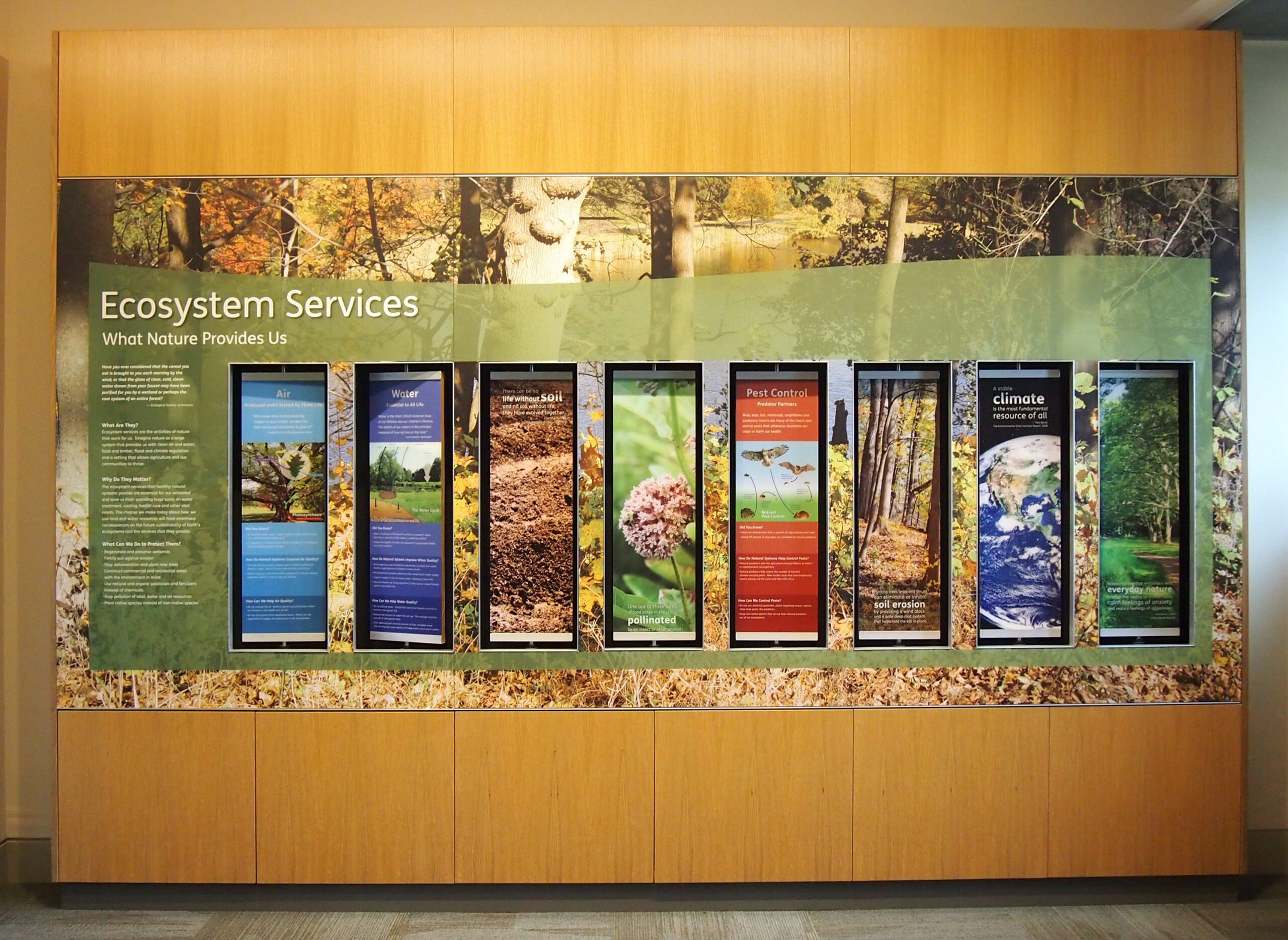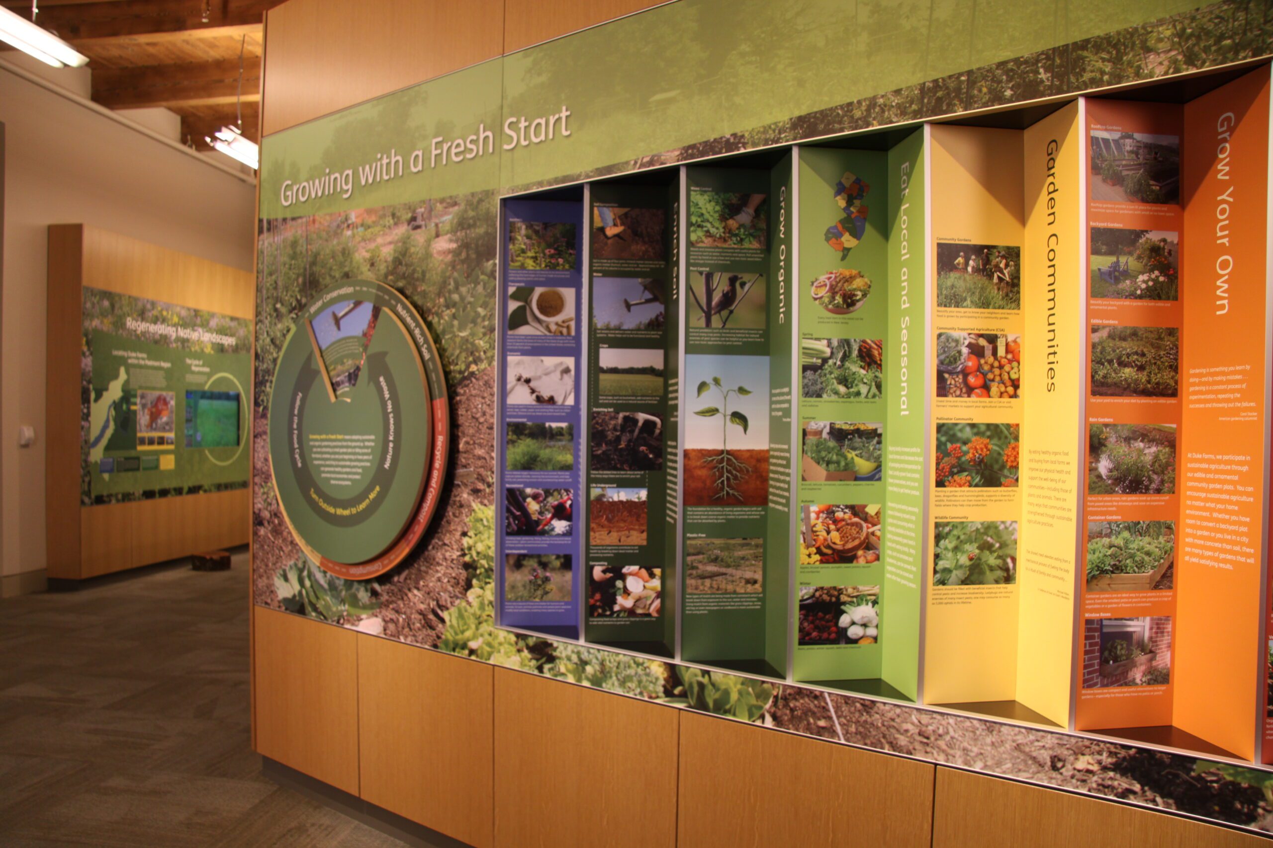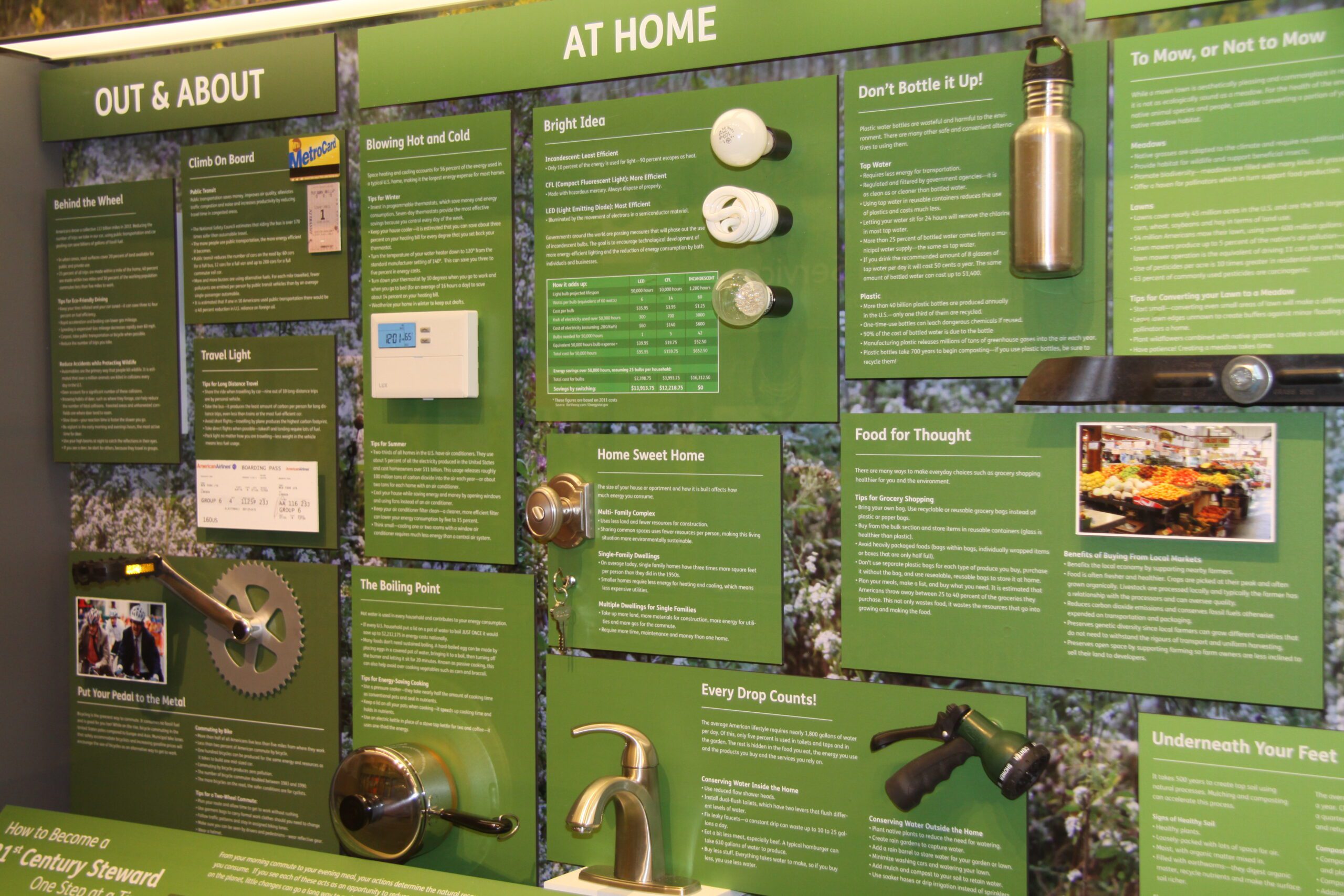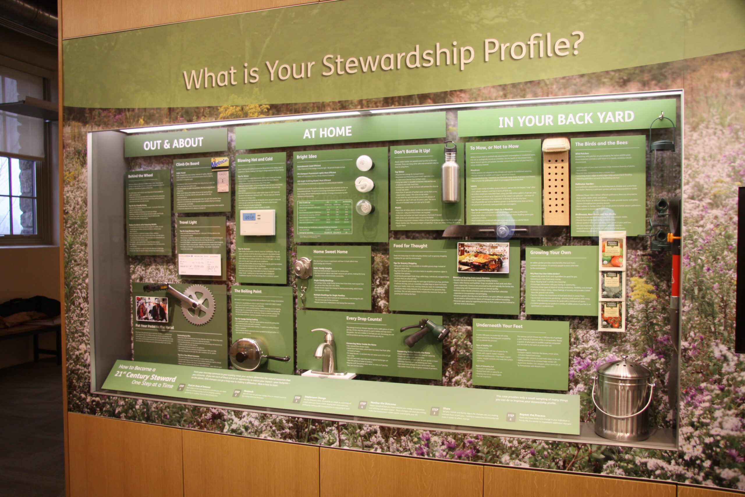 The exhibits in the Orientation Center were designed and fabricated with LEED certification in mind. Made from white oak harvested within 500 miles of the property, the veneers for the panels were milled from the fewest number of trees from the same forest. The interactive displays get their electricity from the solar array and the screens dim unless they are actively being used.