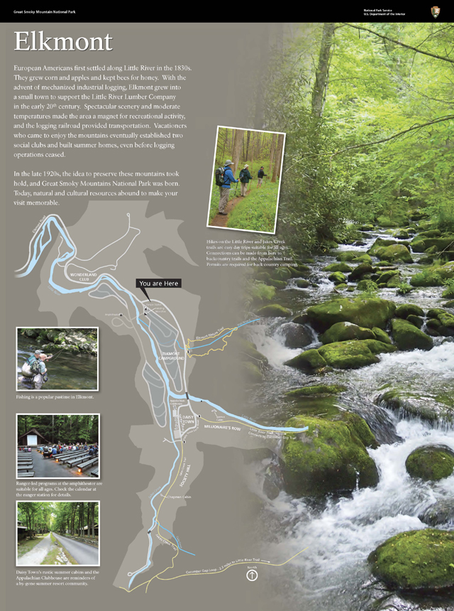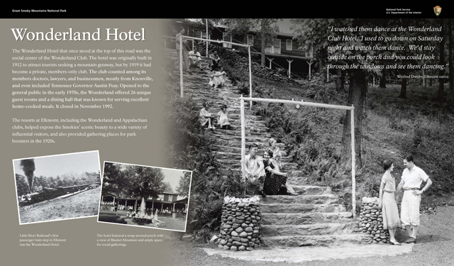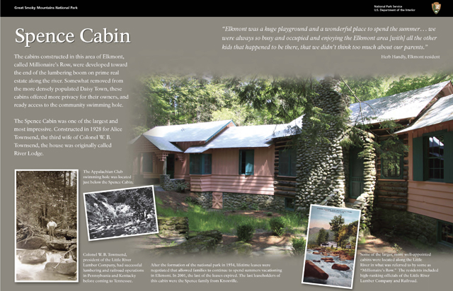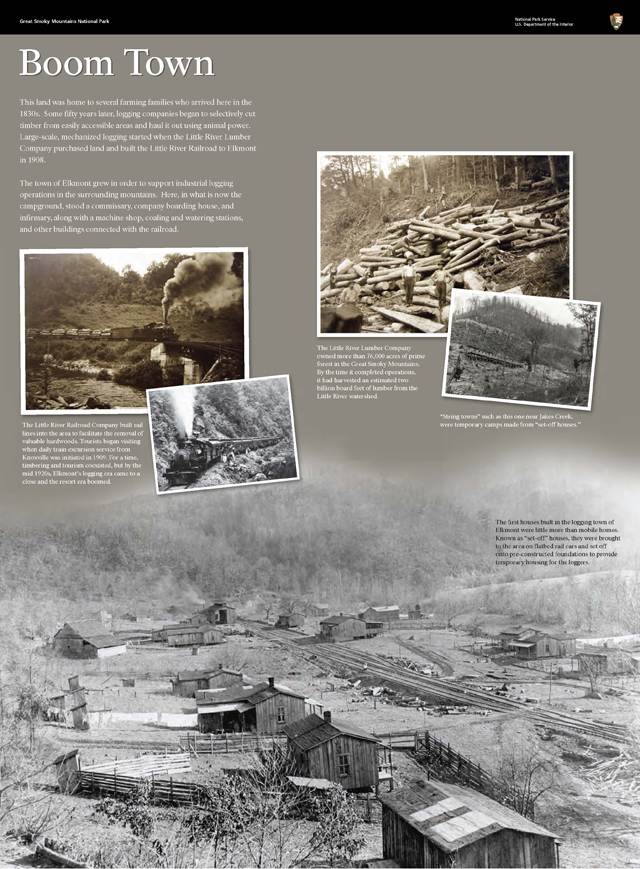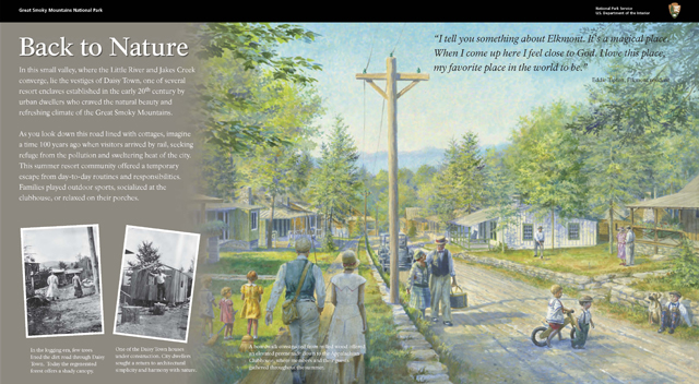 The second series of panels focuses specifically on the Elkmont Historic District, an area originally developed for logging and later adapted for recreation and as an escape from “city life” with a series of summer cottages and club houses.