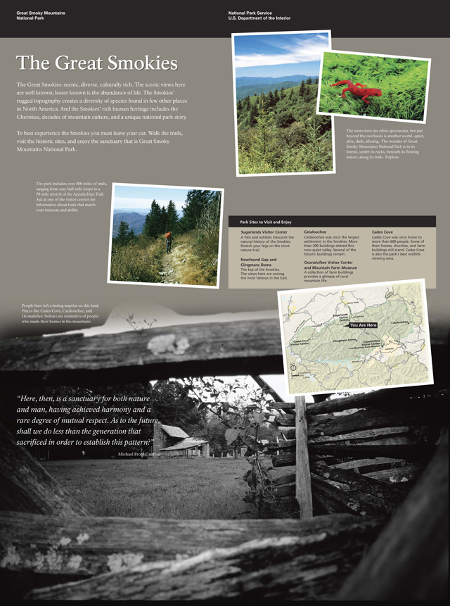As America’s most-visited National Park, Great Smoky Mountains National Park is renown for its diversity of plant and animal life. Whirlwind created two series of interpretive waysides that showcase both its natural and cultural significance.