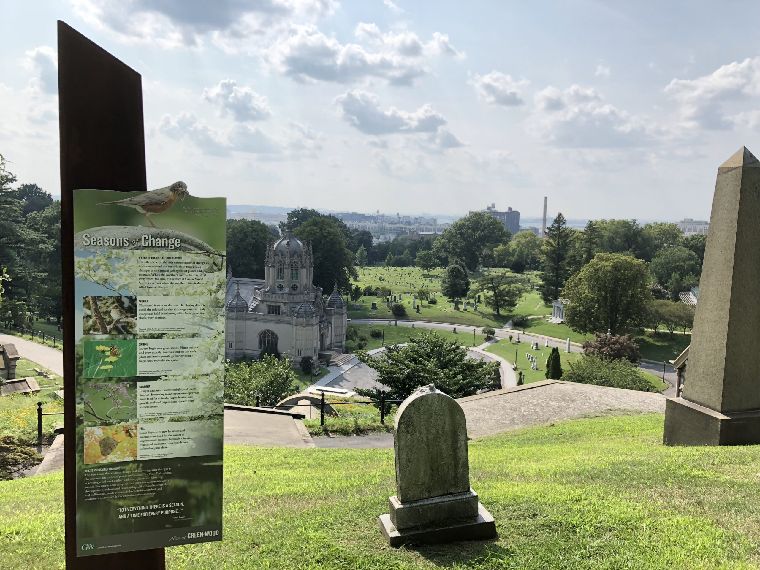A visit to Green-Wood prompts many questions about the cultural history of the cemetery: the landscape, the architecture, monuments and grave markers. Over the course of a century the focus of interpretation was to explore the cultural history — the people who are buried at Green-Wood, the magnificent architecture of the main gates and well-proportioned buildings, the changing style of markers and the enjoyment of a well-manicured lawn.