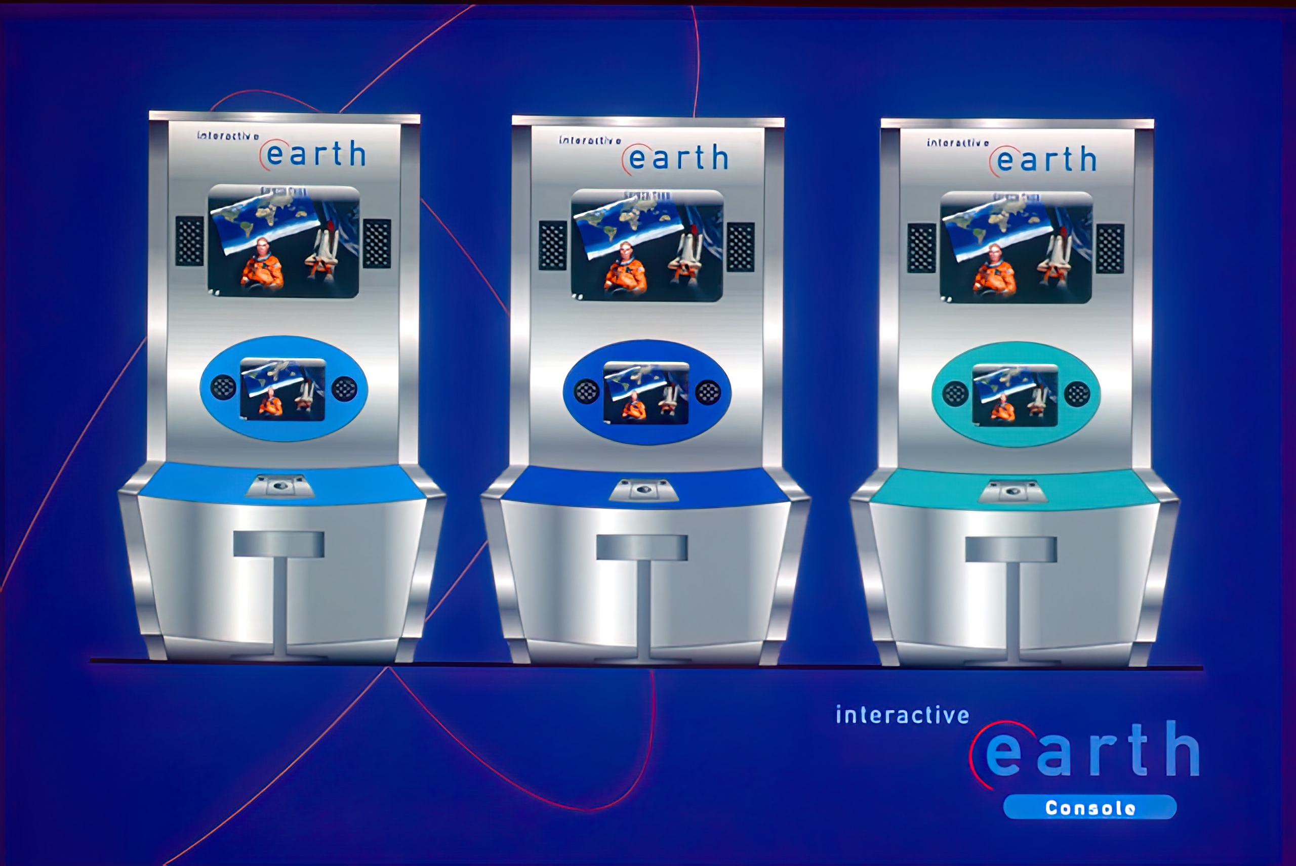In collaboration with Worldlink, creator of Interactive Earth, Whirlwind has developed multiple concept kiosk designs to house this virtual exploration of the earth from space. The program encourages the user to examine the earth from above, making comparisons of natural and human occurrences and recognizing patterns in change over time. Multiple layers allow the pilot of the program to change the visualization of the earth from space, be it weather patterns, ocean currents, population, energy use, forestation and more. The click of the switch can at anytime take you from a spherical earth to a flat map, glimpsing the earth’s continents from a single vantage point.