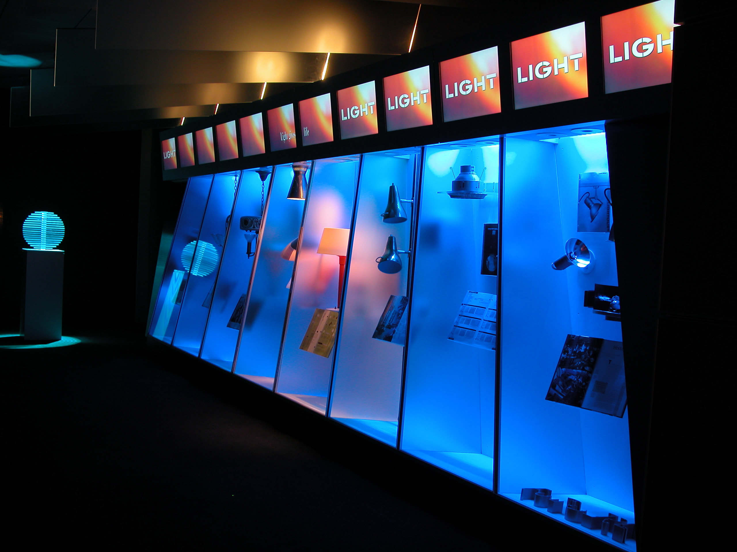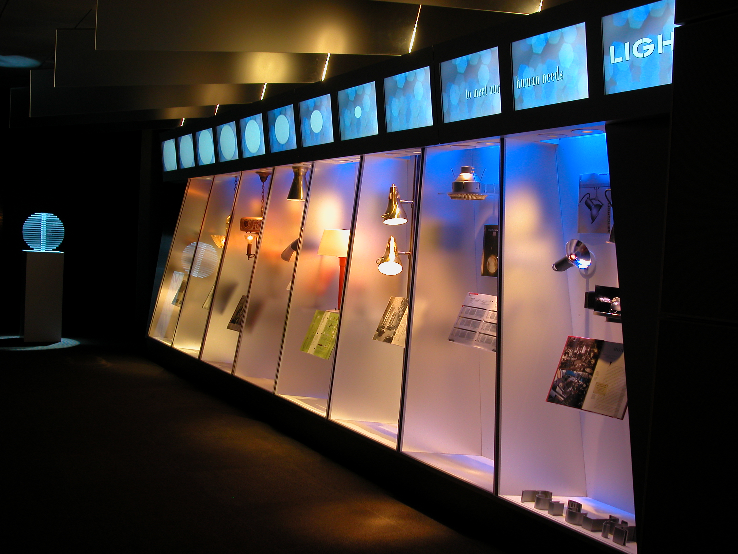 Divided into 7 light rays, each case presents an array of products from the 7 eras profiled in the Lightolier Centennial publication. From a narrow beam highlighting 10 to 15 years in the company’s history, the show slowly unfolds to reveal a full array of history, products and effects.