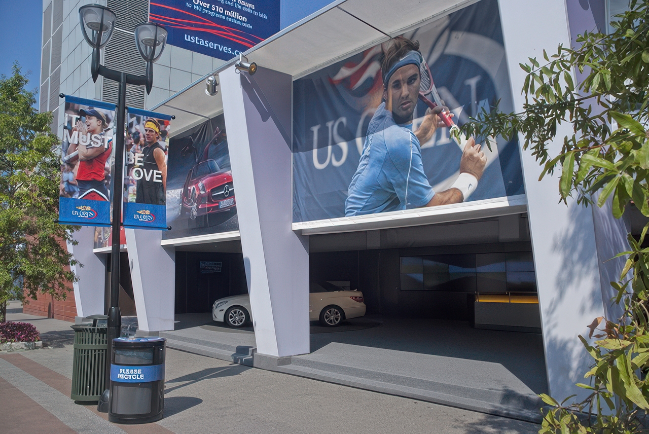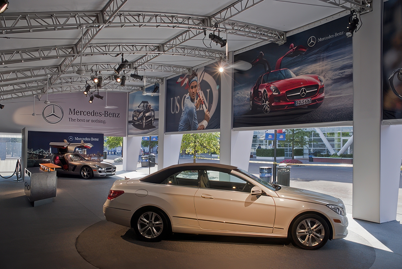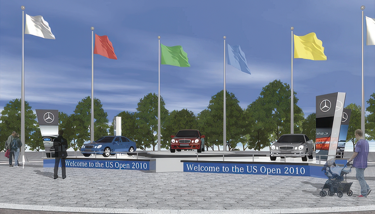 As the official sponsor of the U.S. Open in Flushing Meadows Park in 2010, Mercedes Benz needed a brand center to showcase their latest models and provide meeting space. This semi-permanent pavilion offered an impressive showroom with super graphics on the interior and exterior of the building. An outdoor staging displayed the newest models revolving on turntables and heralded by flagpoles.