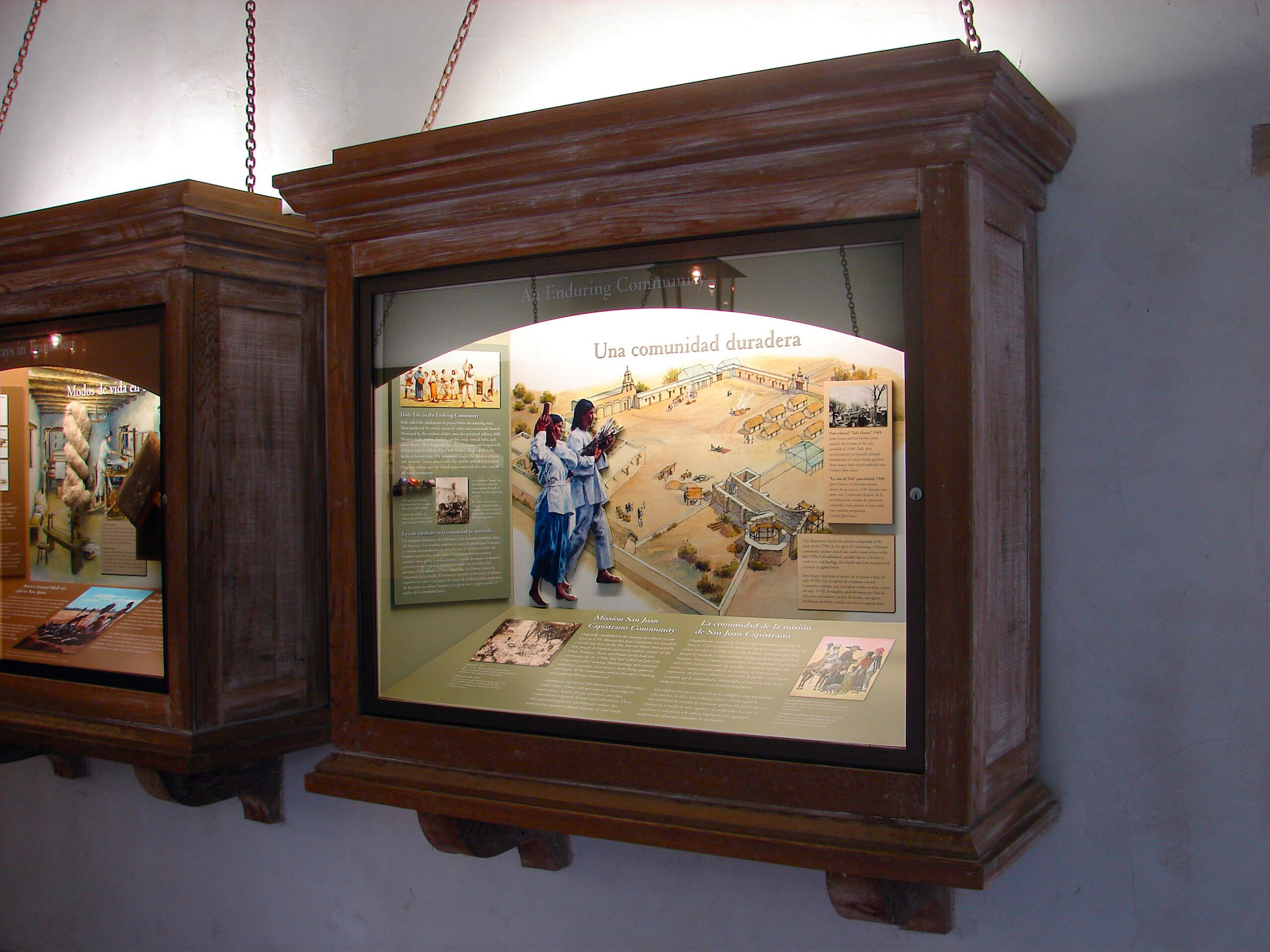 Each case integrated graphic panels with original illustrations and artifacts, telling the history of the Mission and its role in the community. Serving a bi-lingual community, text was integrated in both English and Spanish.