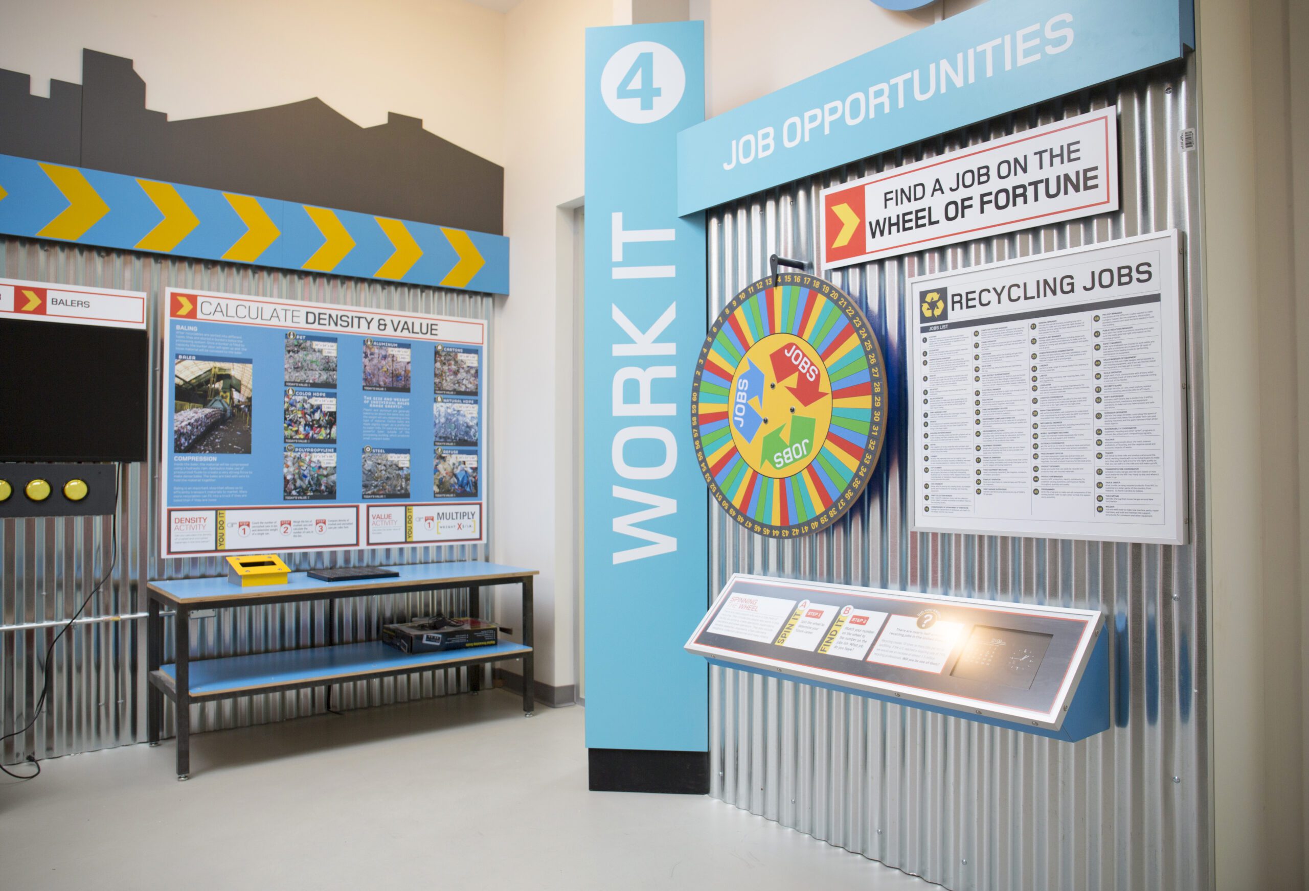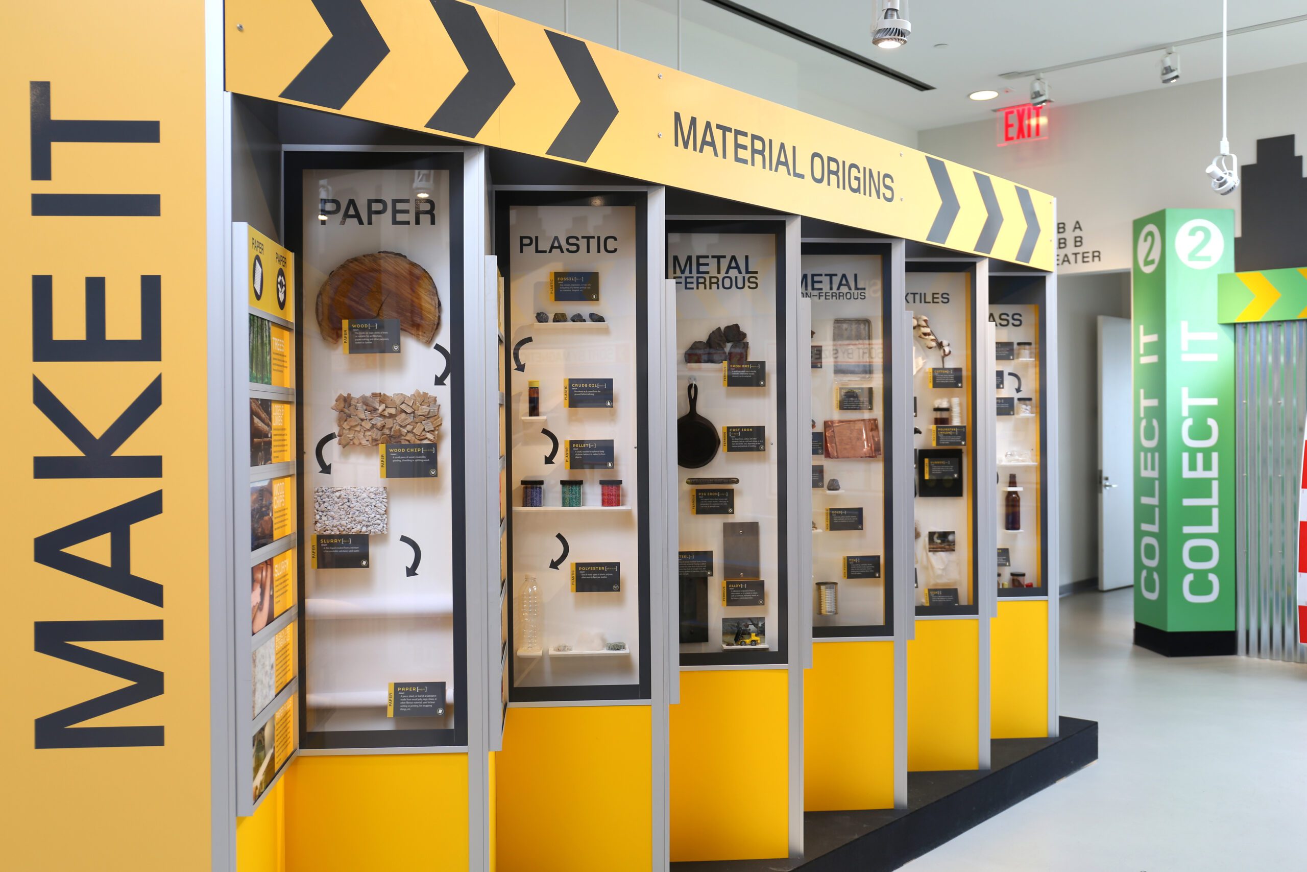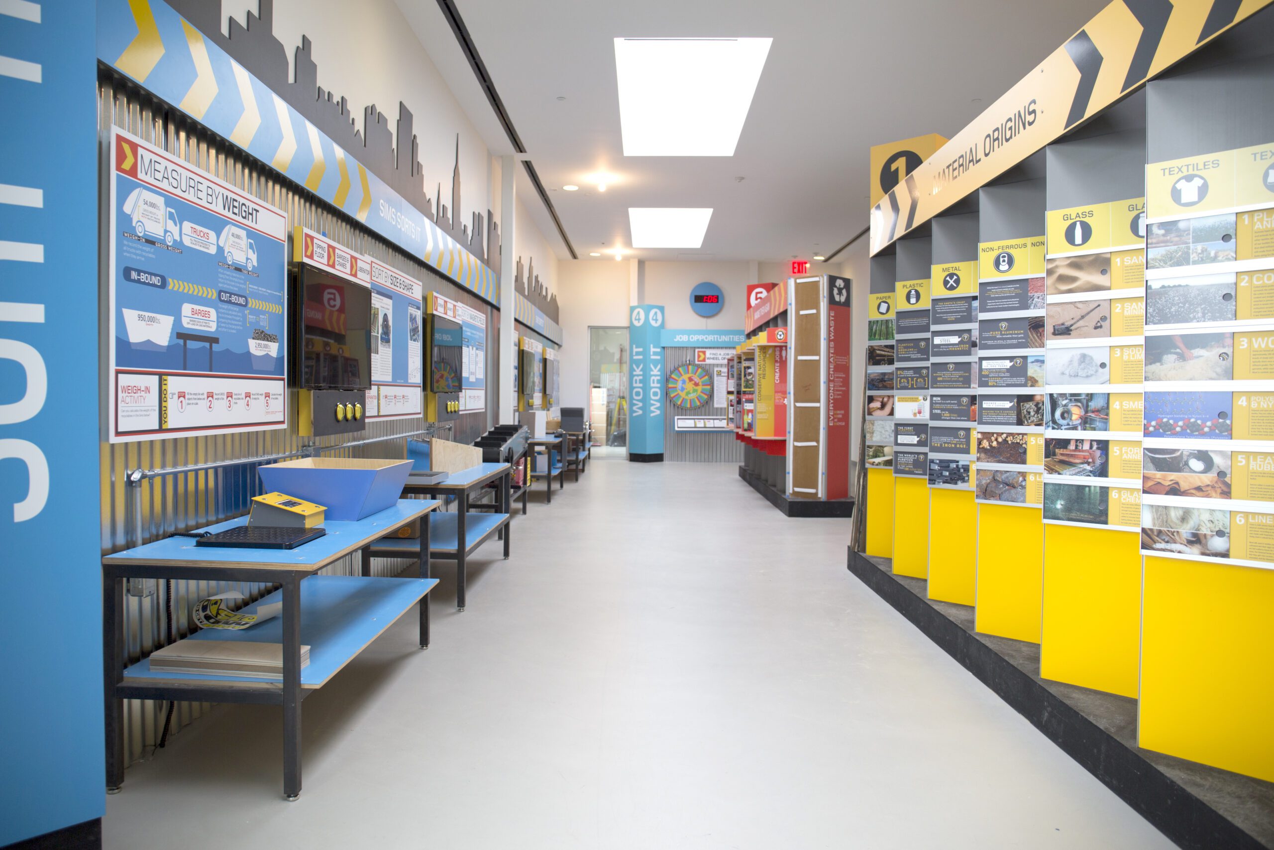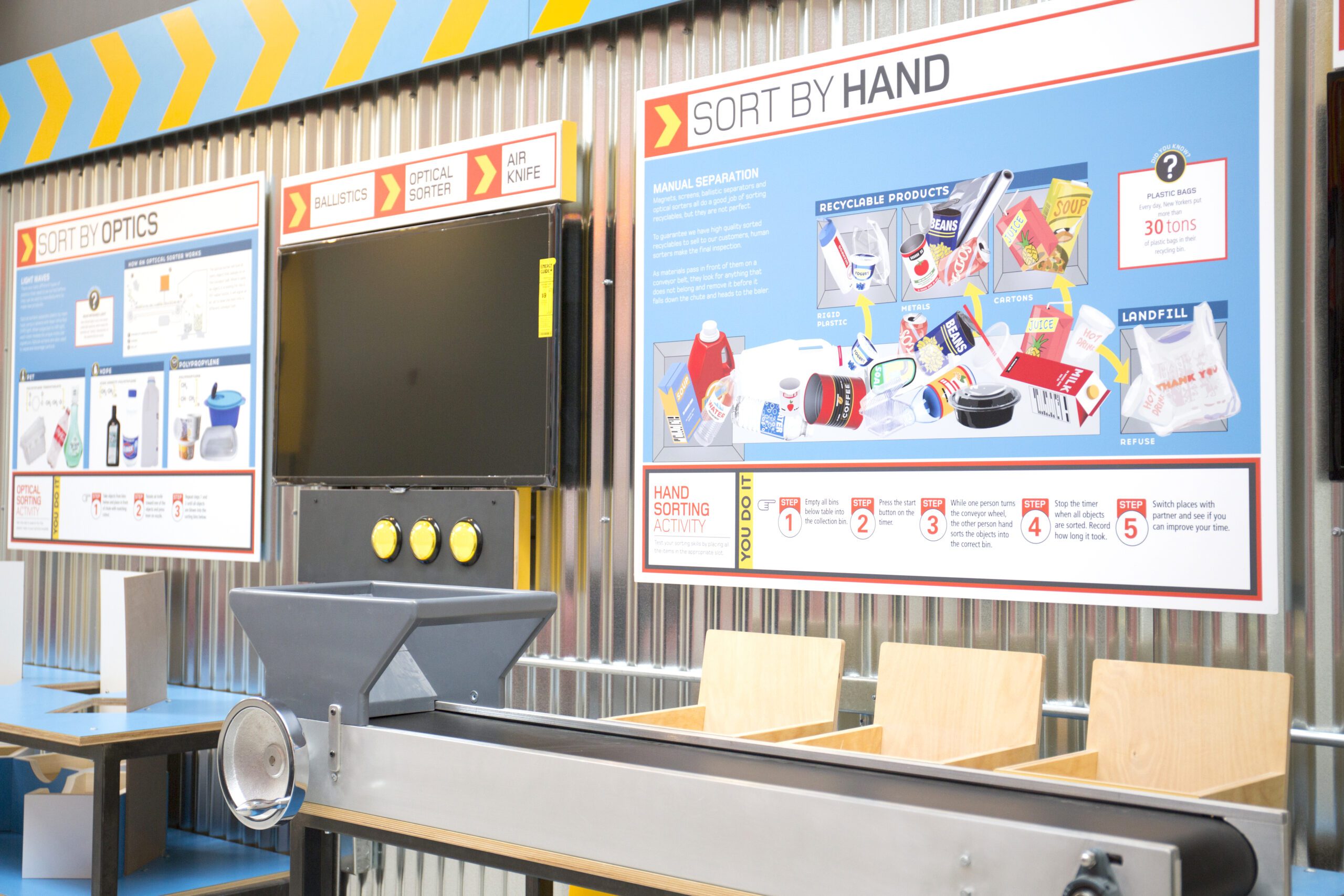 The education center encourages visitors to see recycling in a larger context of the origins of natural resources and energy consumption, systems of collecting and sorting and how the recyclables feed back into the manufacturing of material goods, both saving energy and reducing waste.