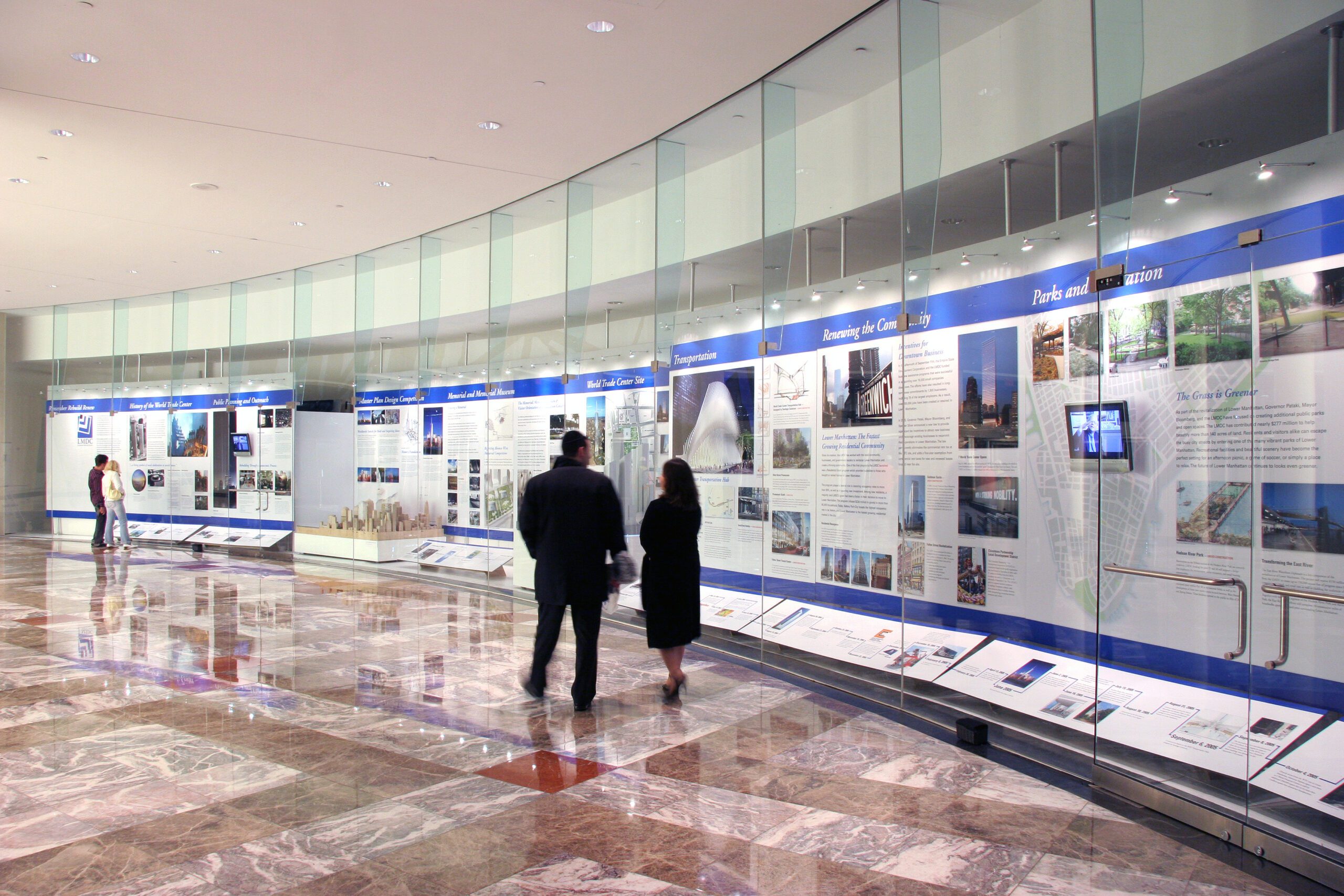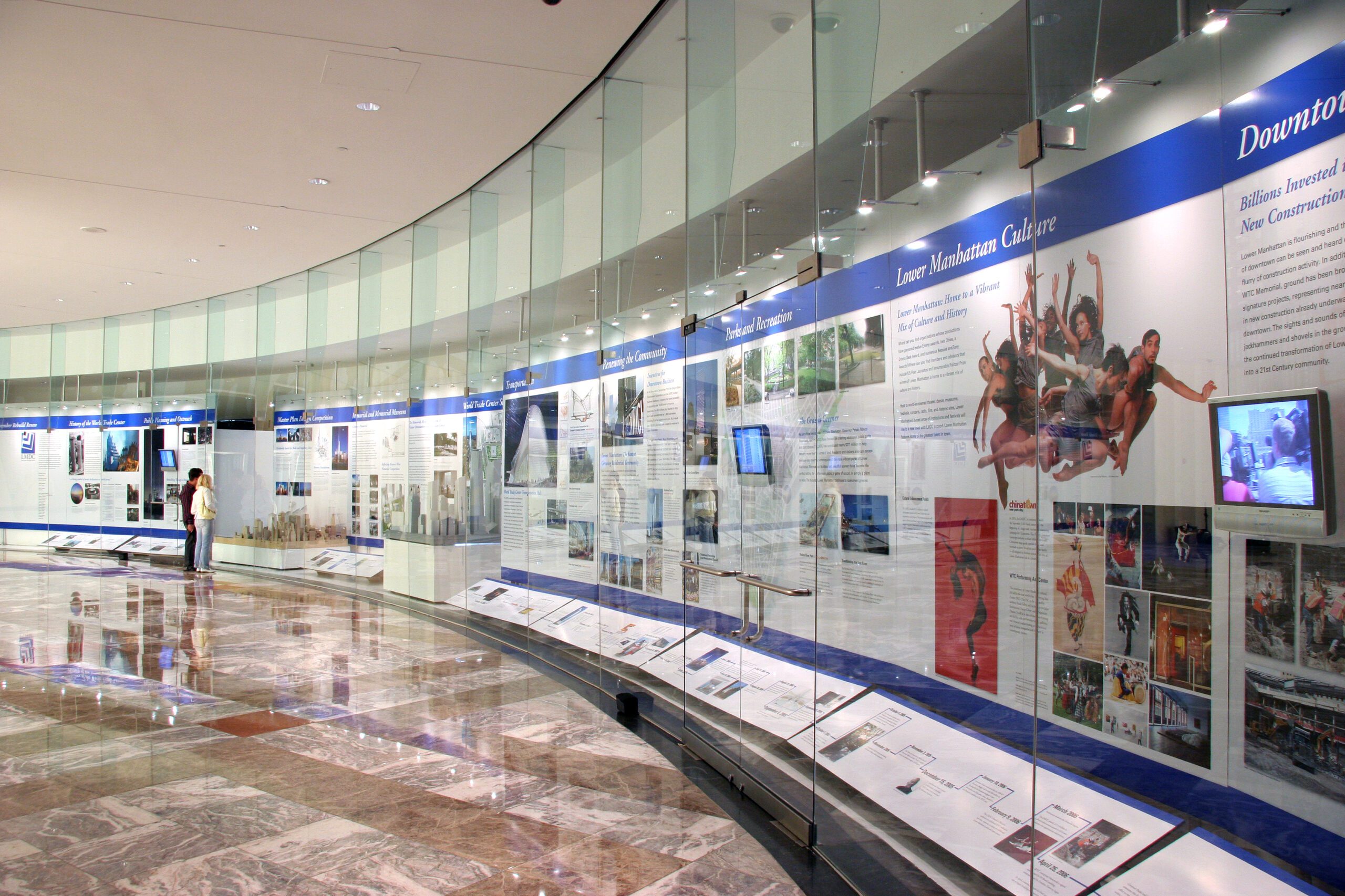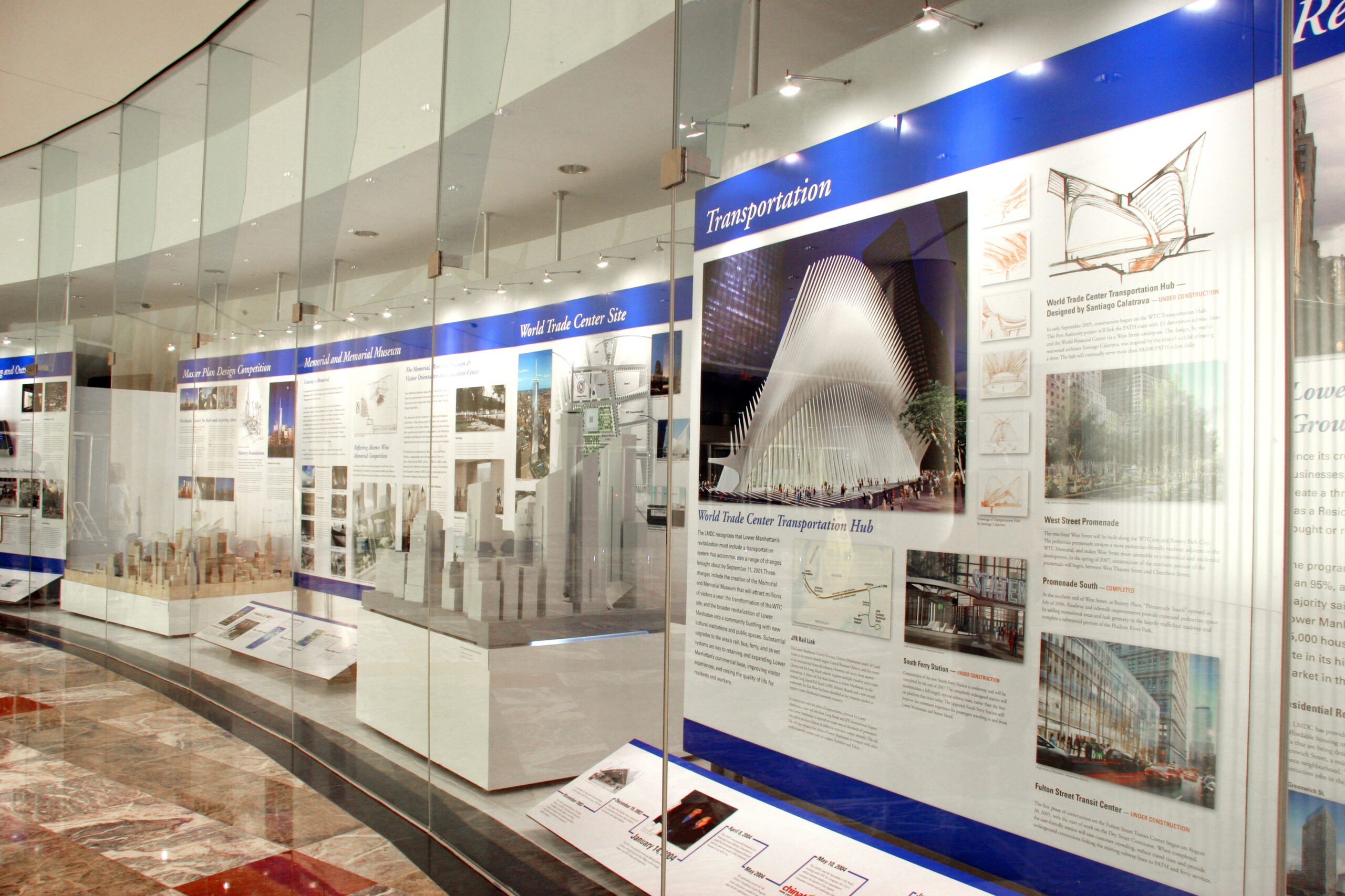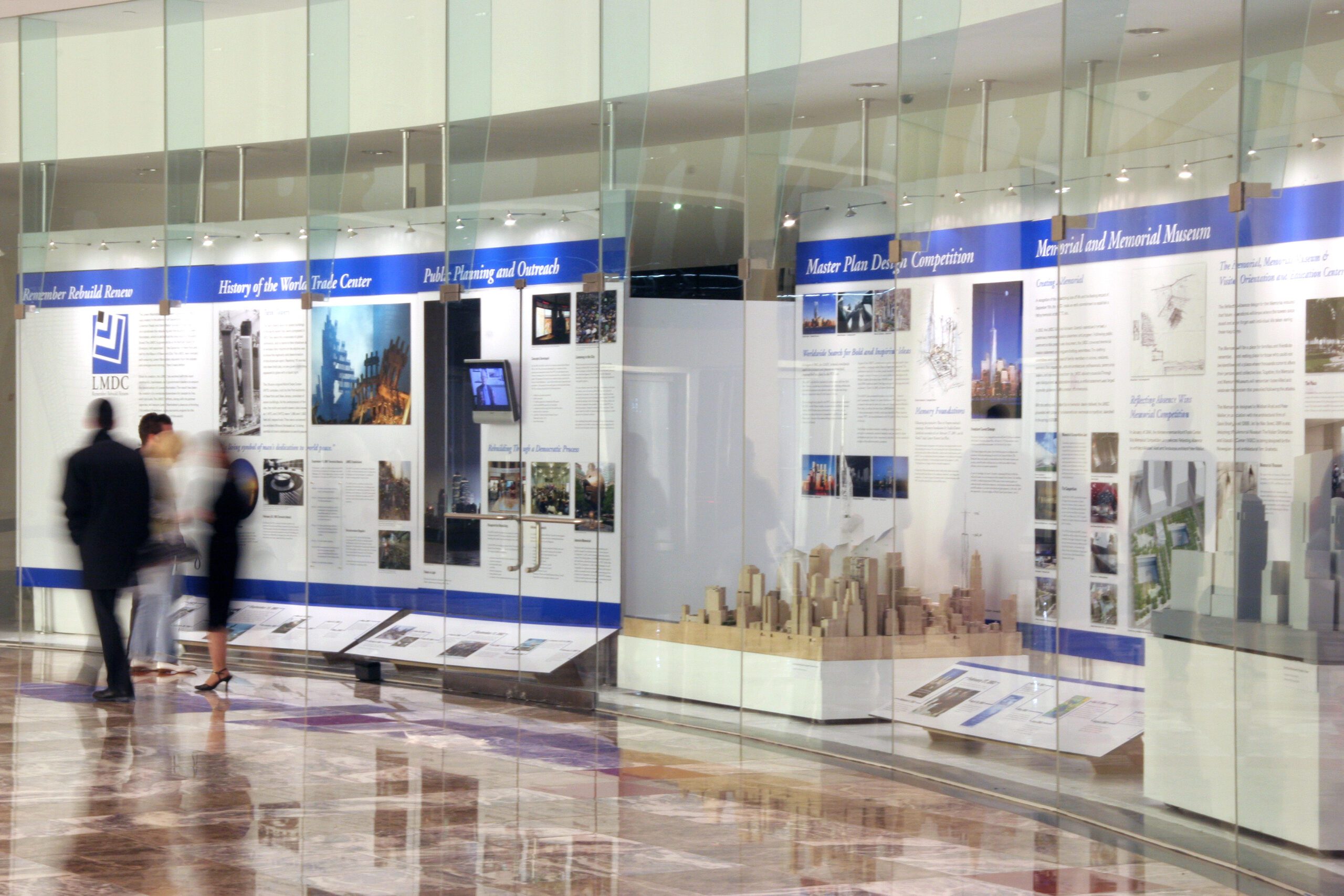 REMEMBER, REBUILD, RENEW is the fourth in a series of timeline exhibits Whirlwind has designed and produced on the events at the World Trade Center site. From the innovative architectural plans, the selection of Daniel Libeskind’s master plan, to the memorial competition, the exhibits at the World Financial Center helped keep the public informed on the plans for the development of the site.