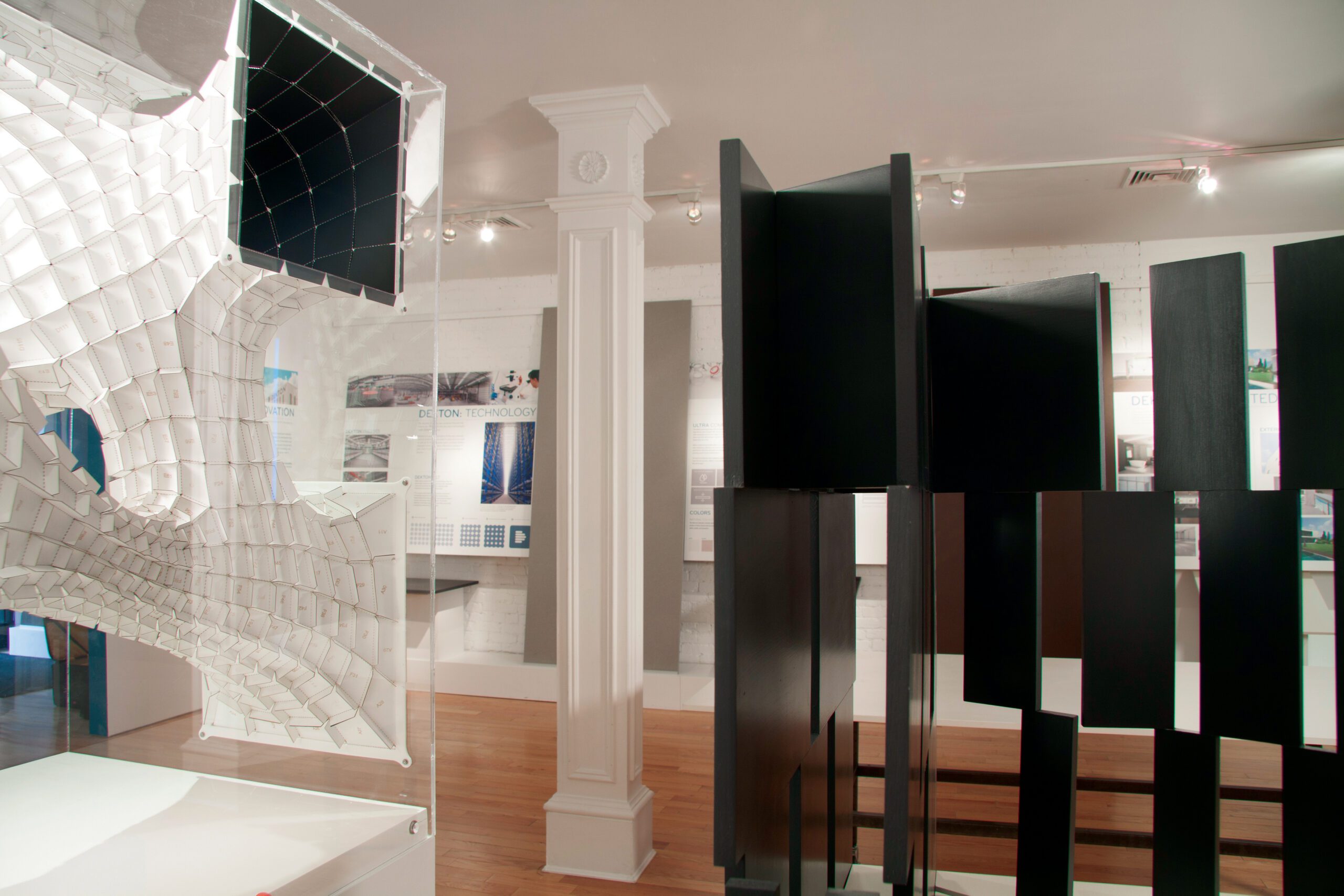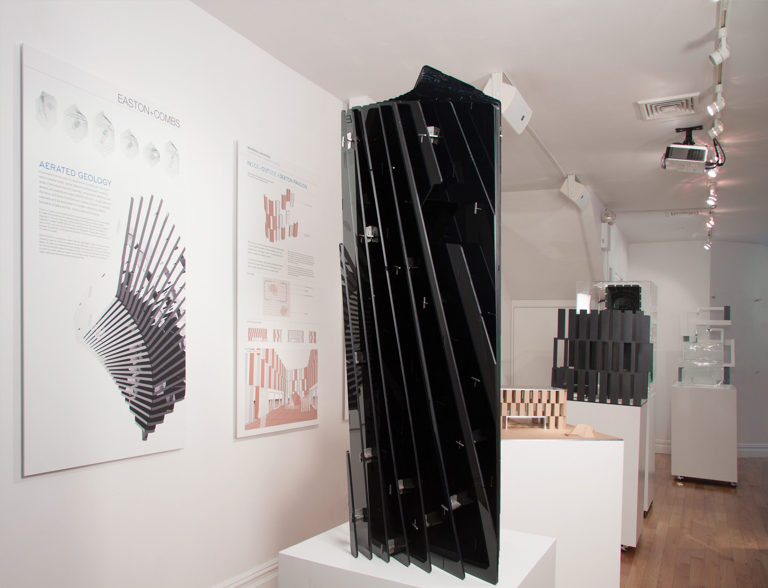 The exhibit presented original concepts for using the material by six emerging New York architecture firms, including Architecture in Formation, Desai/Chia Architecture, EASTON+COMBS, MANIFOLD Architecture Studio, Moorhead & Moorhead, and SOFTlab. One side of the gallery showcased slabs of the material and information about the product while the other presented the models and plans for using the material.