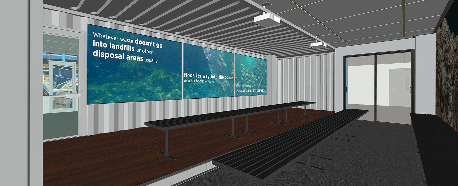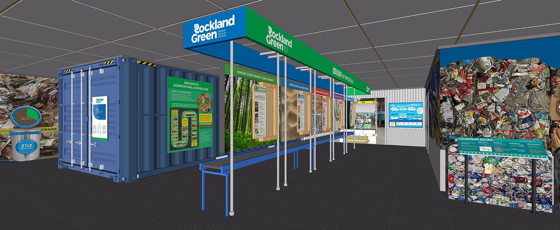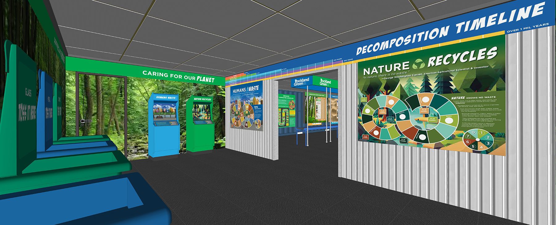 THE ROCKLAND GREEN EXPERIENCE is a 1,500 sq. ft. recycling education center scheduled to open in the spring of 2026. The center includes multiple interactive exhibits that follow the process of recycling from residential collection and special handling to new manufactured products. A fully immersive theater inside a simulated container offers a show select for three different wide screen presentations tailored to different age audiences. Controlled lighting with 5.1 sound-around and vibrating benches lend to the full sensory experience.
