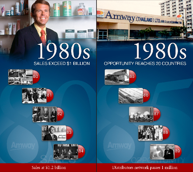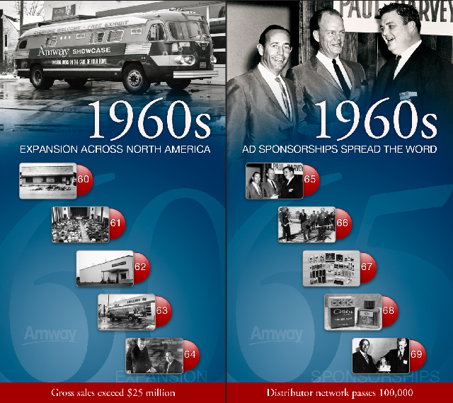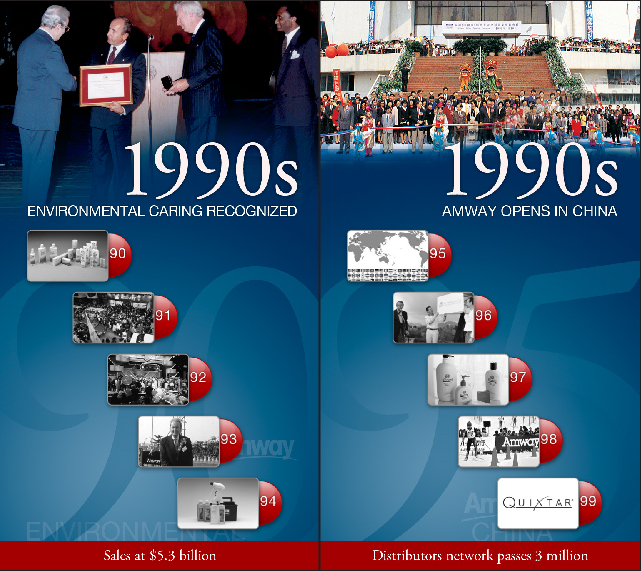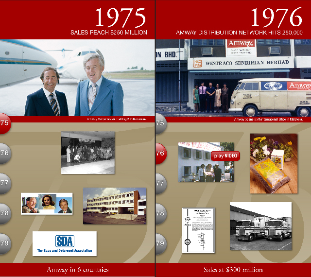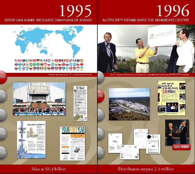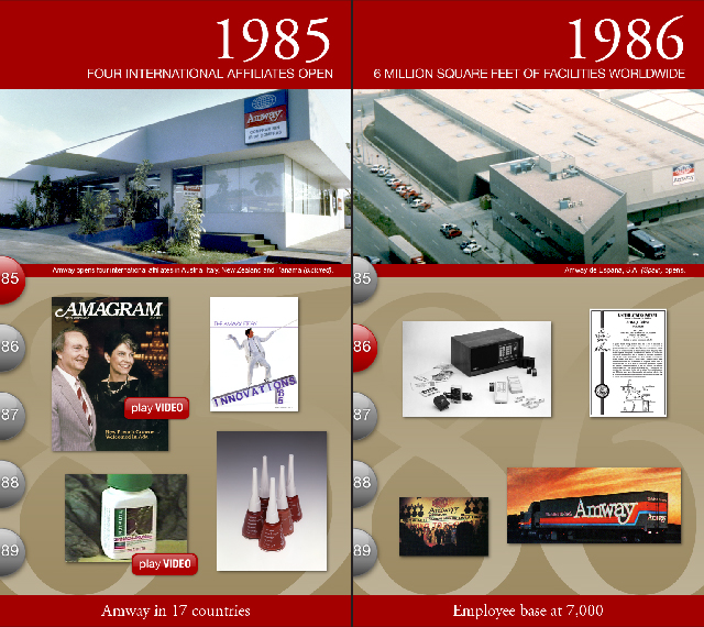 The Amway 50th Anniversary I-Wall traverses on parallel rails, with a moving menu advancing in 5 year increments forwards and rewinding backwards in time, as the visitor moves the screen right or left. The mural behind the vertical touchscreen features highlights from Amway’s 50 years in business.