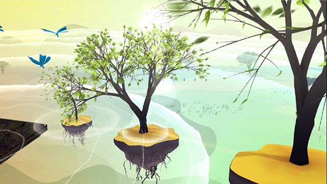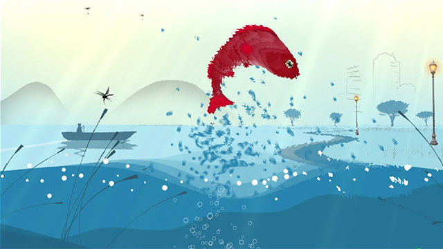 A simple interactive program using a multi-touch screen allows visitors to take feature images from the orientation film and create a whirl of water flowing over the images.